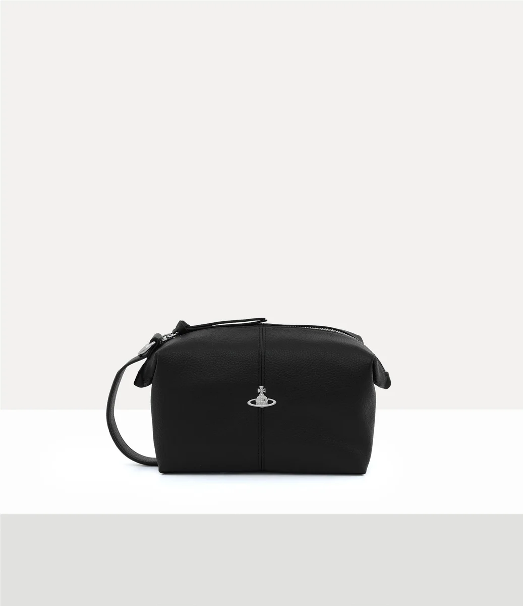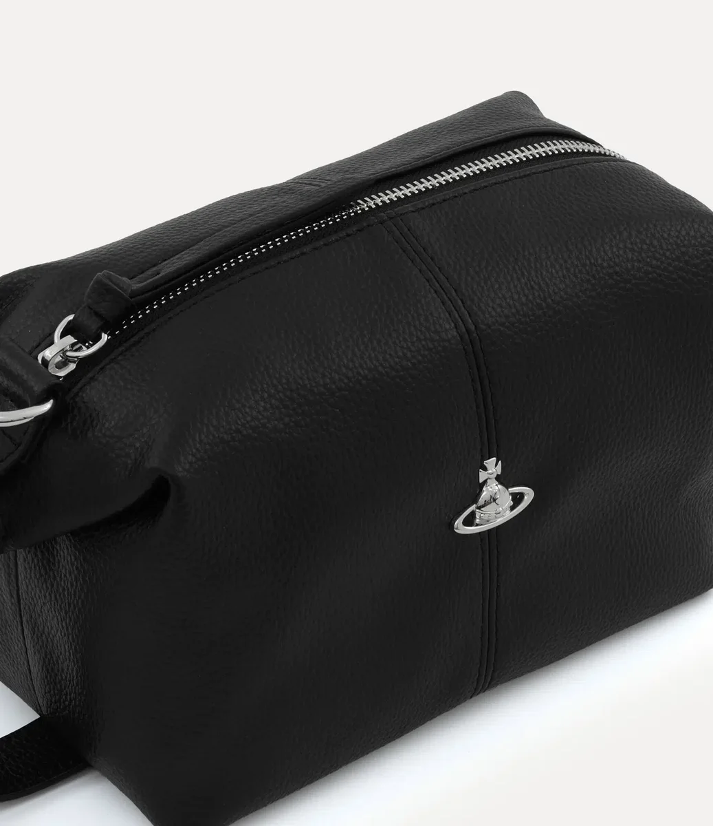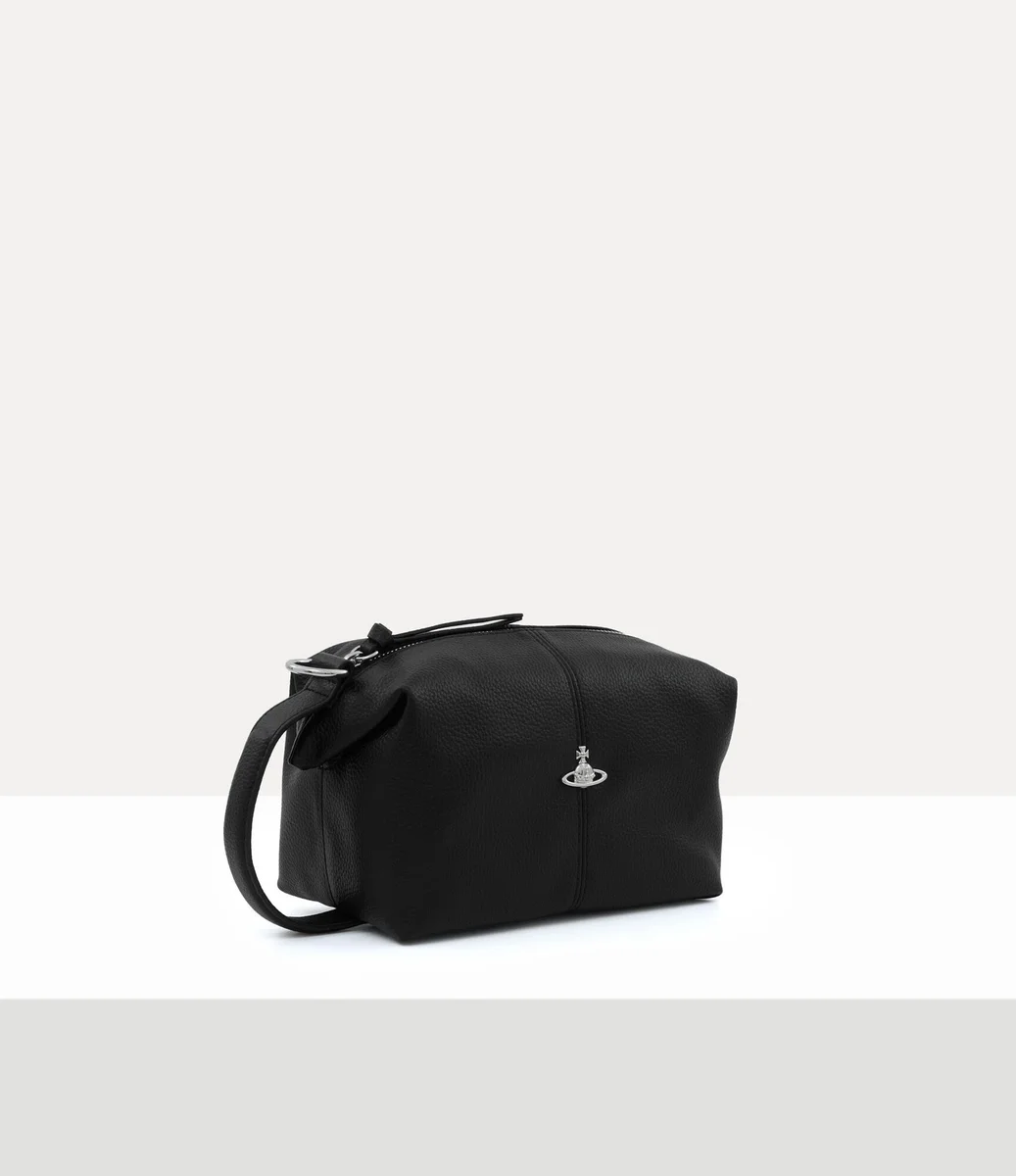 Nuestra bolsa de aseo está confeccionada en piel sintética y presenta un relieve con textura granulada natural en toda su silueta rectangular. Diseñada con un perfil de estructura suave, la pieza se abre para revelar un interior espacioso y está rematada con un emblema tridimensional plateado en forma de esfera en la parte delantera, que recuerda la visión de Vivienne de lanzar la tradición hacia el futuro.