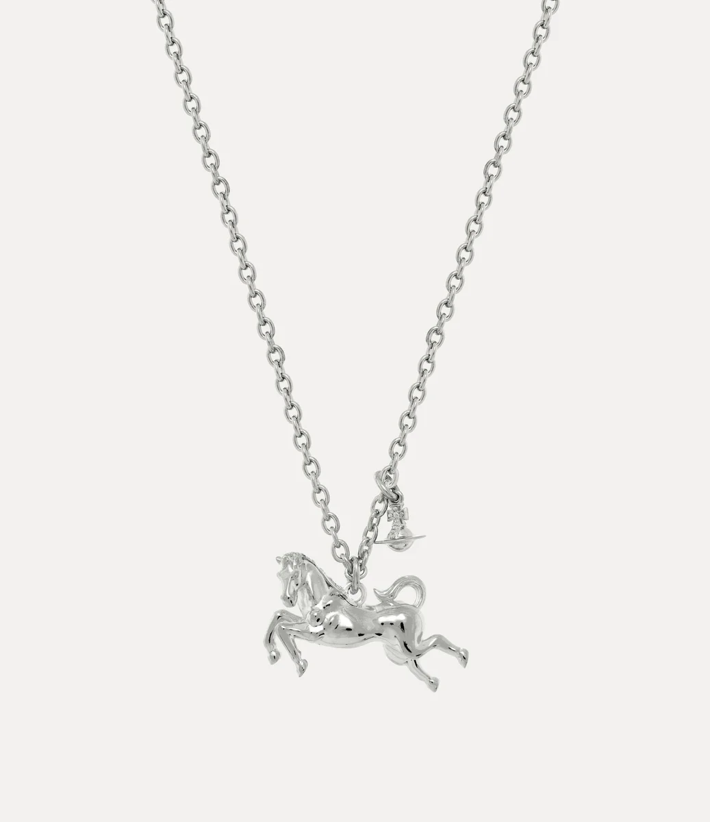 El collar con colgante Man. Cheval presenta el motivo del caballo de esta temporada, que simboliza la energía y la aventura, suspendido de una delicada cadena chapada en platino. El intrincado motivo se complementa con el icónico charm esférico de la casa, rematado con un seguro cierre de langosta.