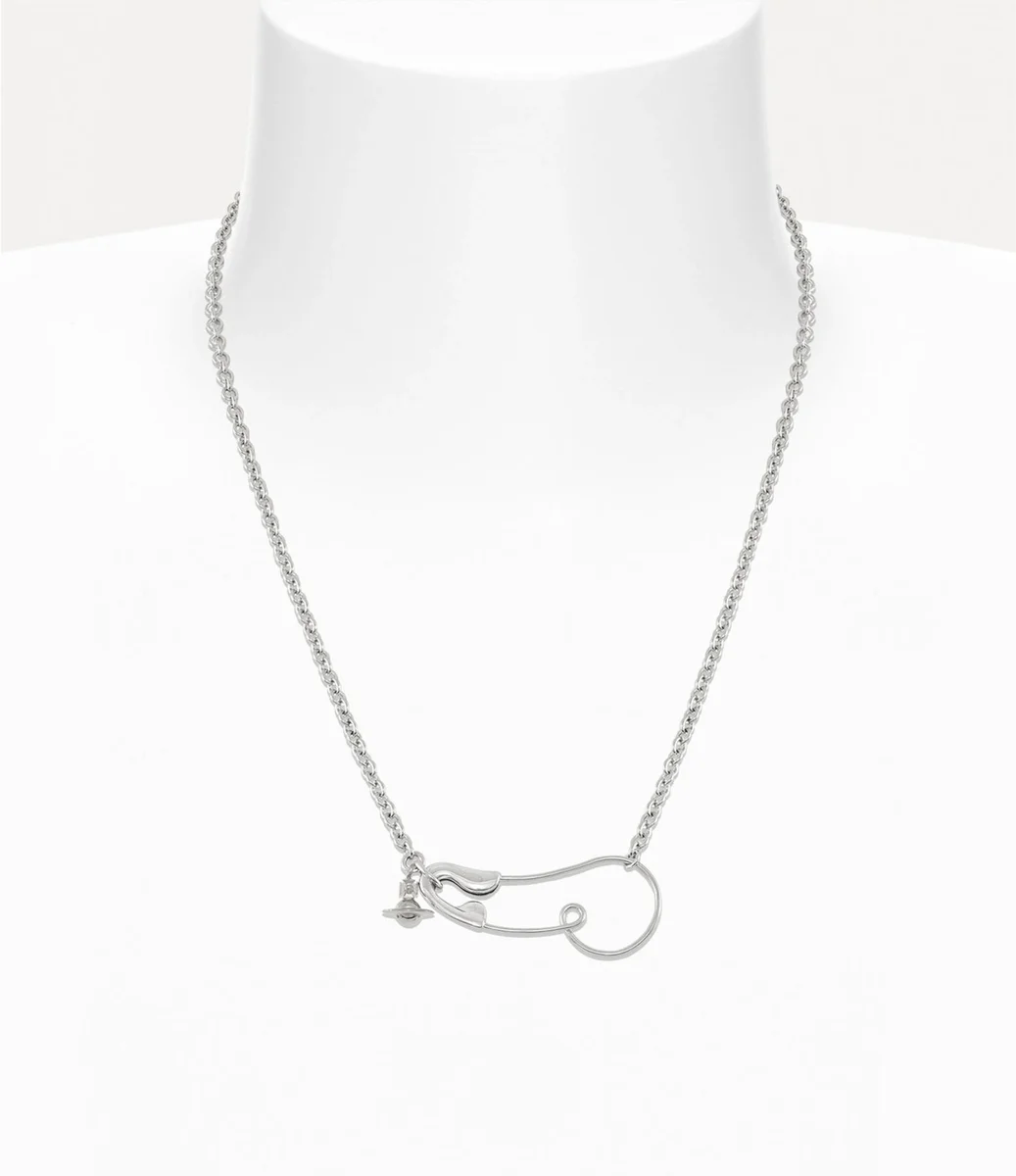 La silueta del pene es un motivo recurrente en la herencia de la casa, que ha aparecido en muchas colecciones a lo largo de nuestra historia. Esta temporada, el collar con colgante Man. Maxima reimagina este motivo con una silueta de alambre, suspendida de una cadena plateada, y acentuada por un orbe tridimensional colgante.