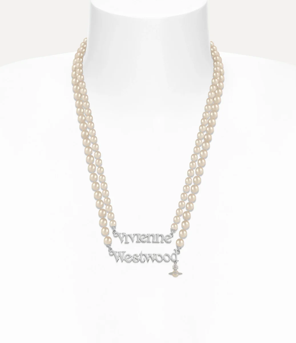 Nuestro collar Man. Emilio en tono plateado cuenta con dos filas de brillantes perlas Swarovski, que evocan una sensación de grandeza y lujo. En el centro, el diseño presenta el motivo característico de las letras «Vivienne Westwood», del que cuelga un charm en forma de esfera de perlas.