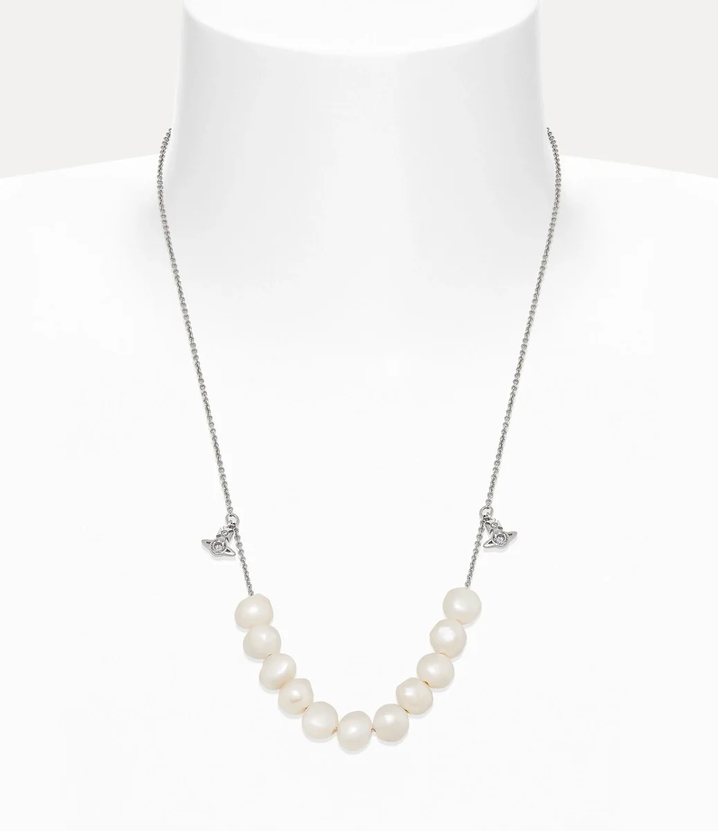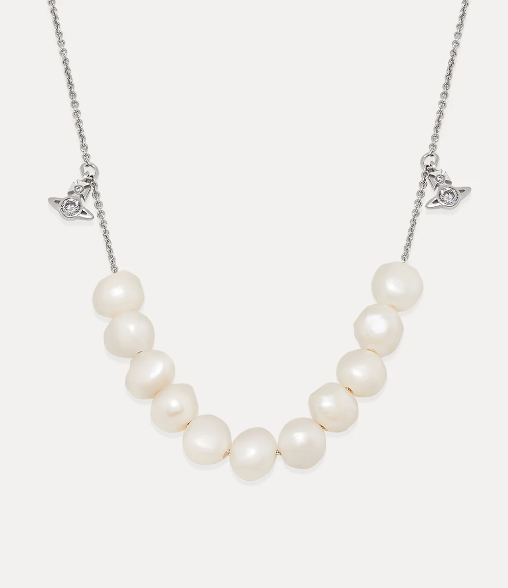 Las perlas siguen siendo un elemento esencial de la iconografía de la casa, evocando una sensación de lujo pasado. Nuestro collar Man. Azul presenta una fila de perlas barrocas de agua dulce ensartadas en una cadena traza, rematada con dos motivos esféricos colgantes a ambos lados del diseño.