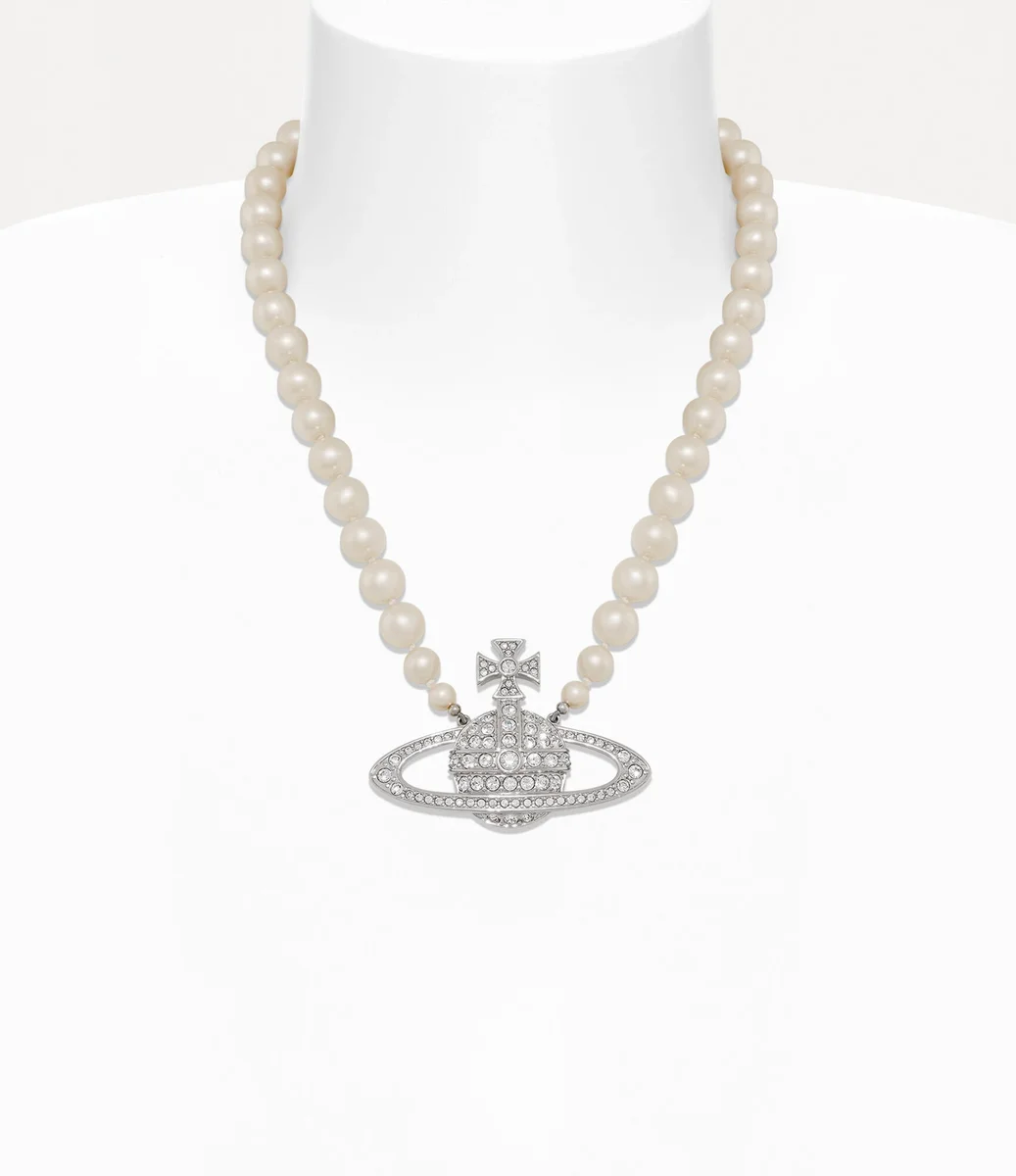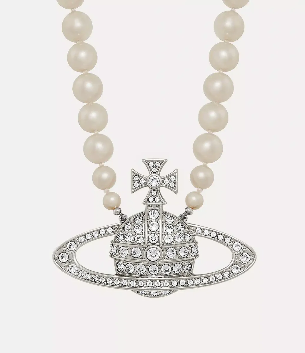Las perlas son esenciales en el legado de la casa, ya que evocan una sensación de lujo pasado. Nuestro collar Man. Bas Relief Pearl presenta una fila de perlas Swarovski anudadas a mano, con un elegante degradado de tamaños, y se completa con un motivo de esfera adornada con cristales en el centro del diseño, sinónimo de la visión de Vivienne de lanzar la tradición hacia el futuro.