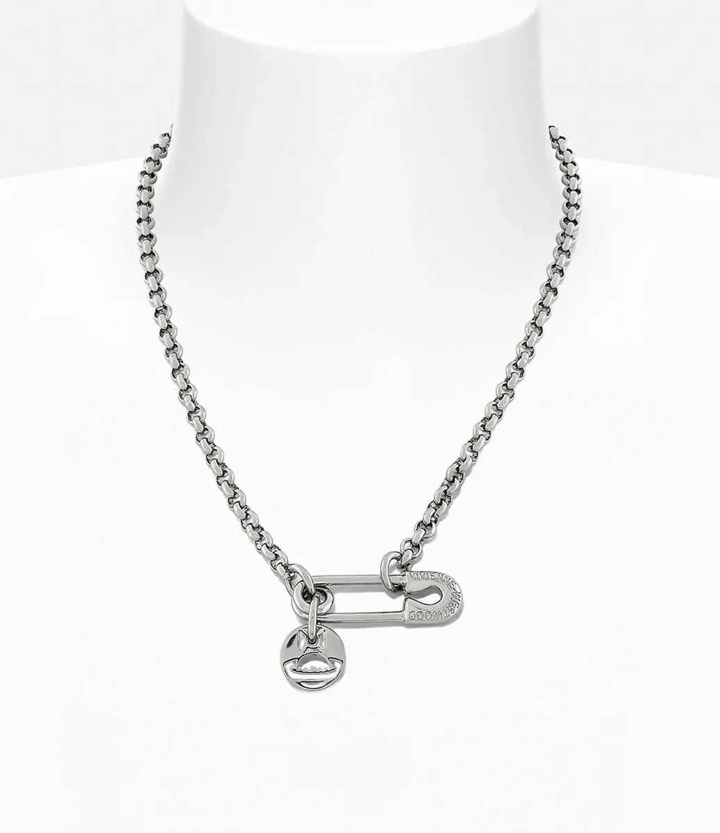 El collar Man. Imogene en tono plateado presenta una placa esférica recortada que cuelga del extremo de un charm con forma de imperdible grabado. Cuenta con una cadena tipo belcher y un cierre de mosquetón.