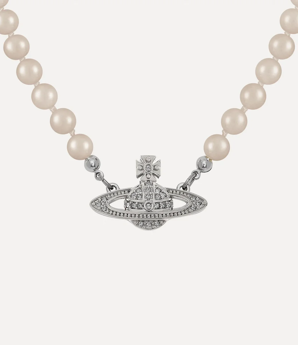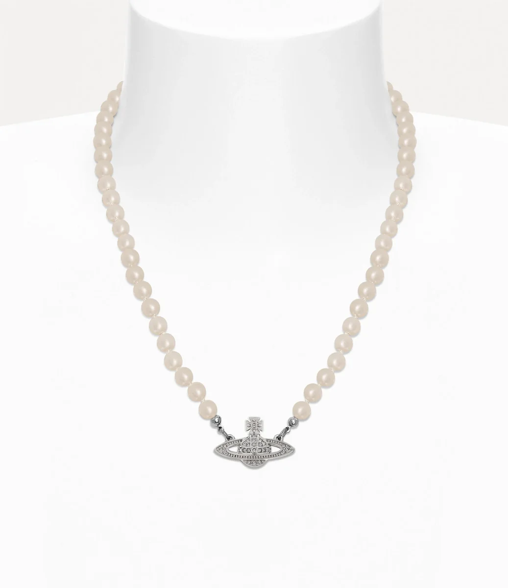 Las perlas siguen siendo un elemento esencial de la iconografía de la casa, evocando una sensación de lujo pasado. El collar Man. Mini Bas Relief Pearl presenta una cadena de perlas de vidrio, con un orbe plano incrustado de cristales en el centro del diseño, que evoca la visión de Vivienne de lanzar la tradición hacia el futuro.