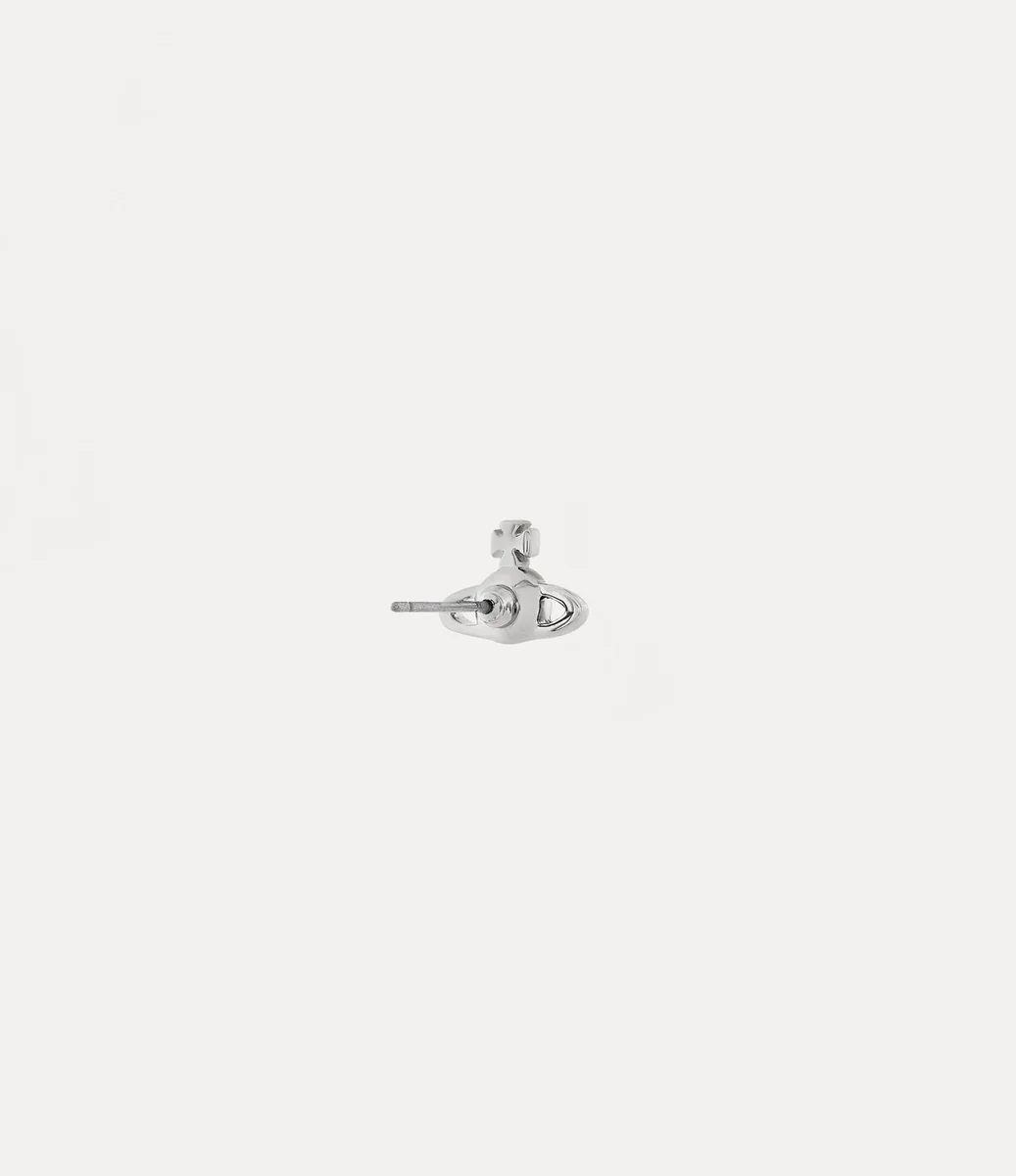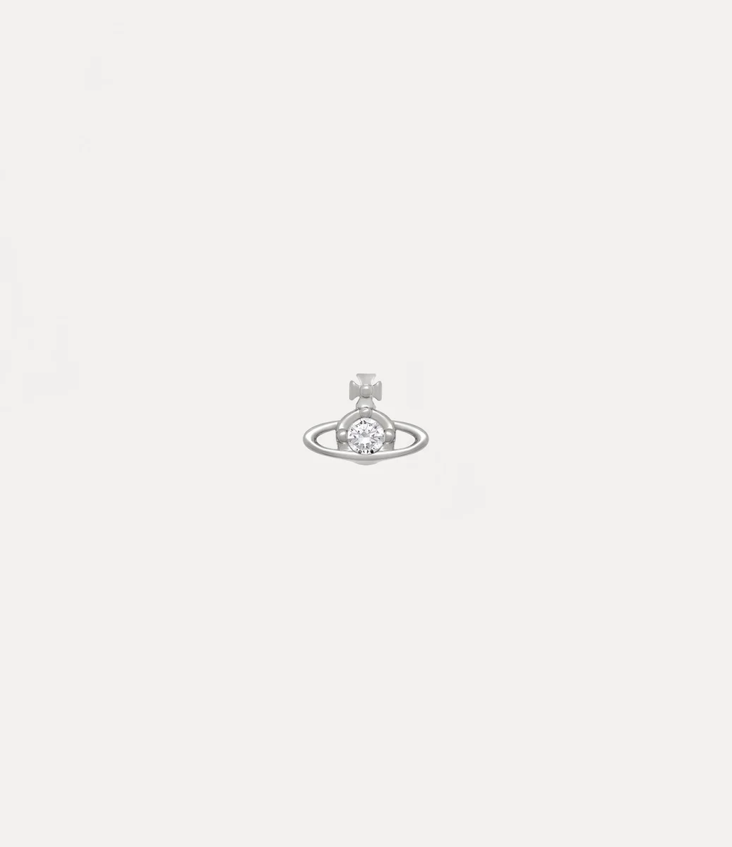 El pendiente Nano Solitaire es un estilo emblemático de la casa, con una silueta esférica bidimensional en tono plateado, inspirada en el motivo esférico de la casa. Adornado con un brillante cristal blanco en el centro del diseño, la pieza recuerda la visión de Vivienne de llevar la tradición al futuro.