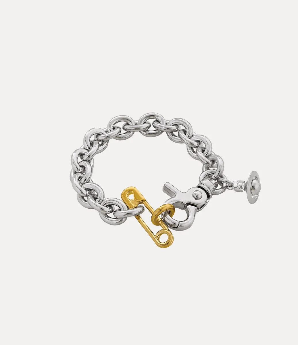 La pulsera Man. Claude, diseñada con un acabado plateado, presenta nuestro característico detalle de imperdible, un guiño al estilo punk y anticonformista de Vivienne. Un charm metálico tridimensional con forma de orbe cuelga de la resistente cadena de cable, lo que añade un aspecto dinámico a la pieza, mientras que el cierre inspirado en la ferretería permite un fácil cierre.