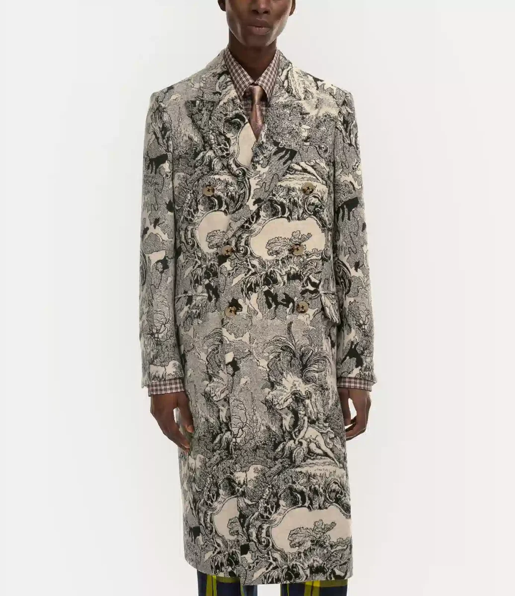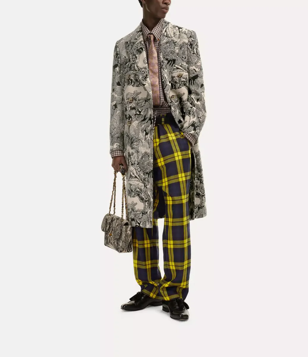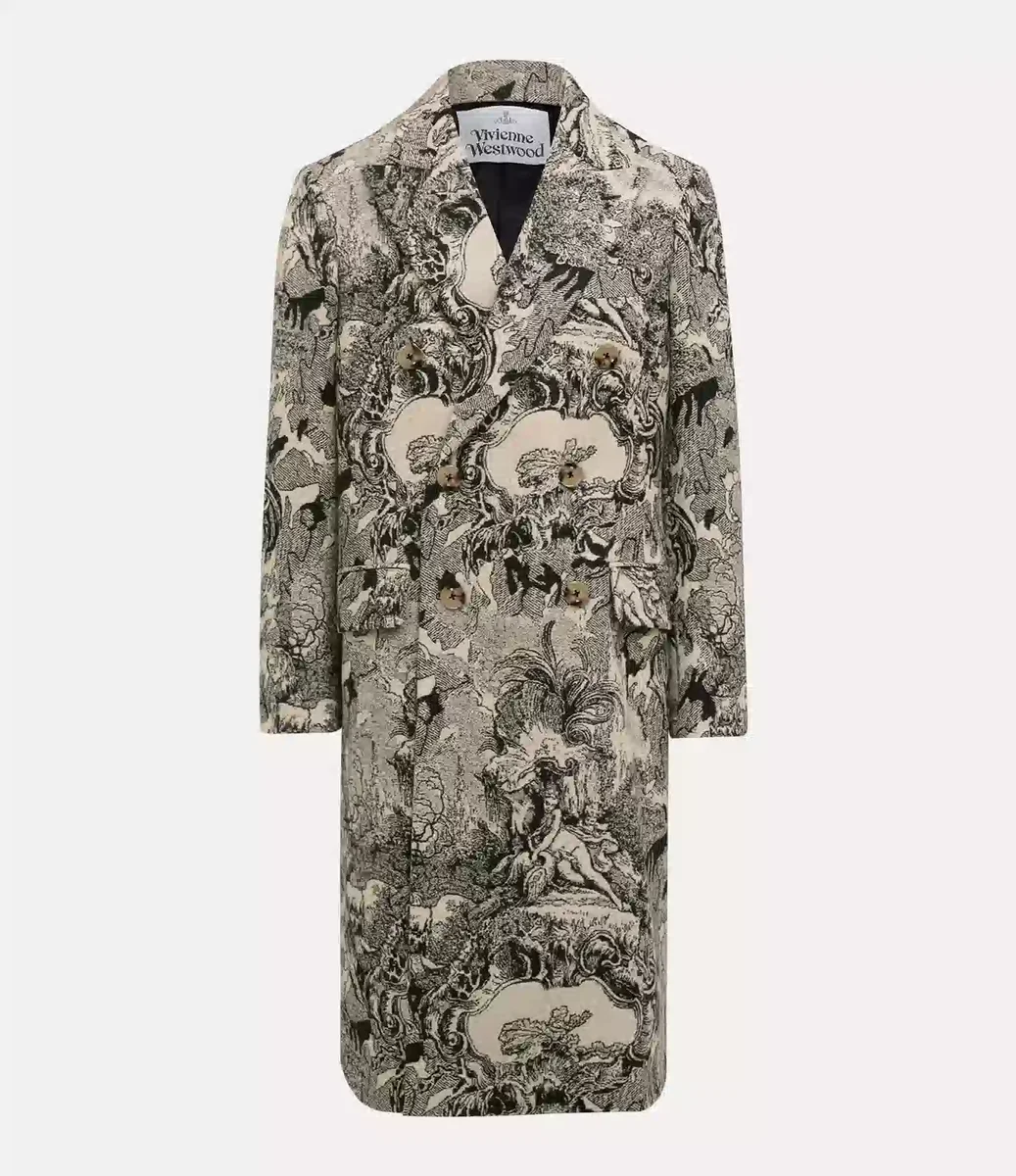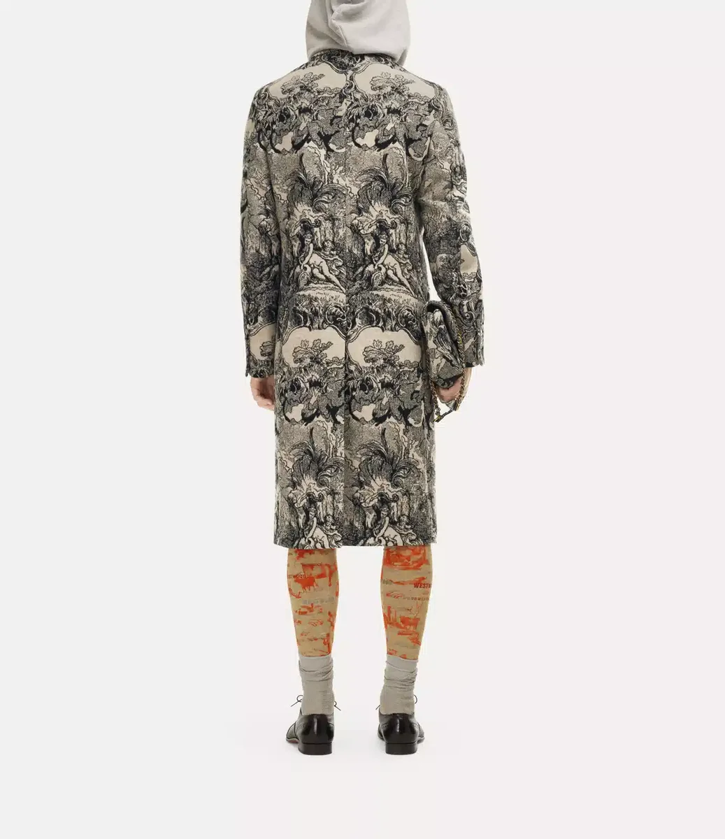 Nuestro abrigo clásico de doble botonadura está confeccionado en lana cepillada de gran calidad y presenta el jacquard monocromático «Venus» de esta temporada, un guiño a la admiración de Vivienne por la historia del arte. Diseñado con hombros estructurados y solapas anchas con muesca, la prenda cae hasta una silueta refinada a la altura de la rodilla.