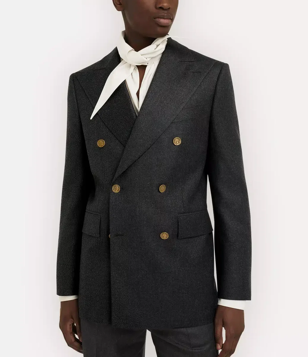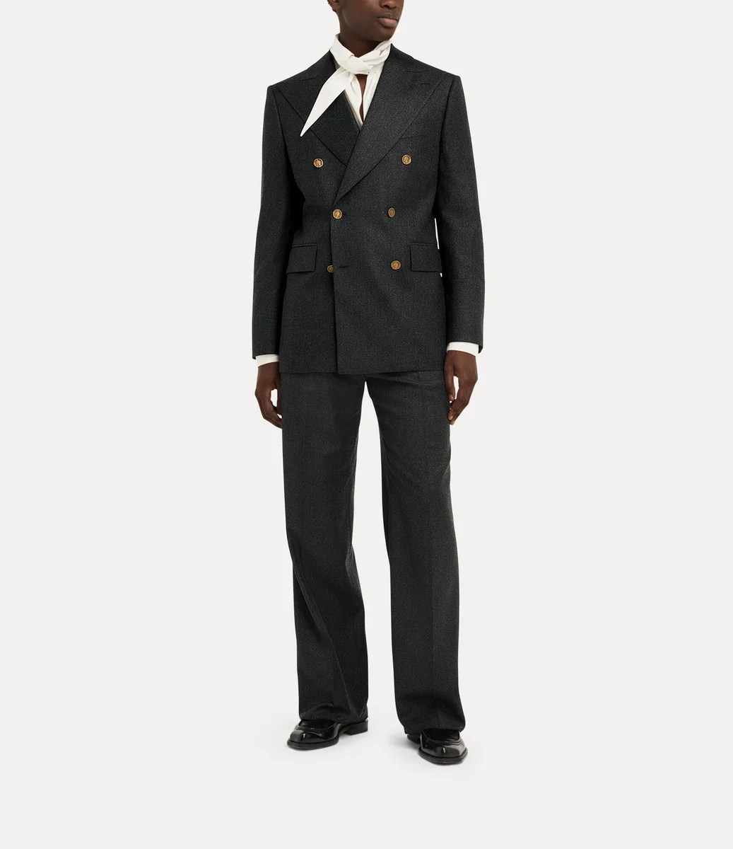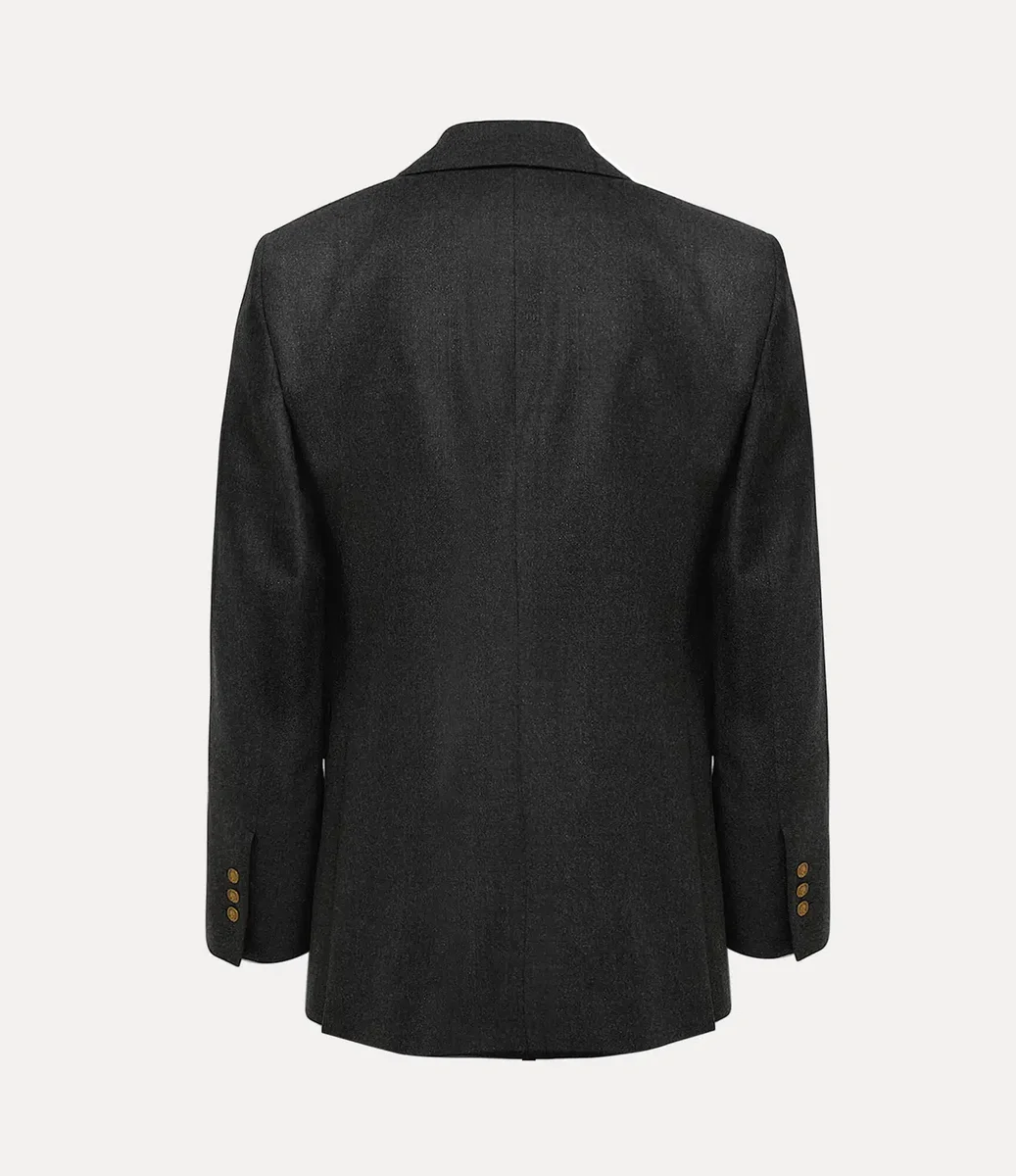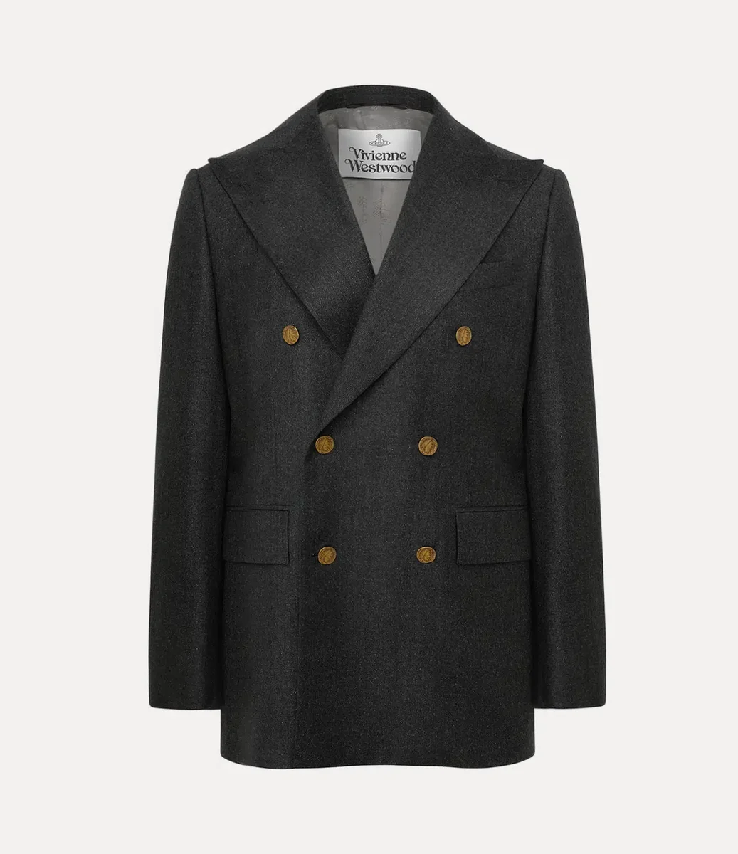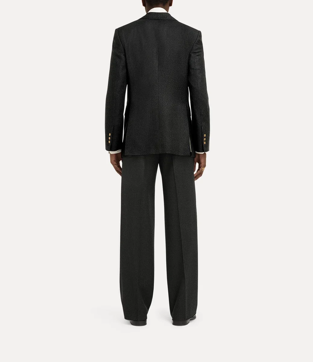 Nuestra chaqueta Captain presenta un perfil de lana, delicadamente tejido con un acabado metalizado cepillado. Enmarcada por solapas afiladas, la silueta cae hasta un dobladillo limpio con aberturas traseras, y se completa con nuestro forro interior «Tossed Orb», sinónimo de la visión de Vivienne de lanzar la tradición hacia el futuro.