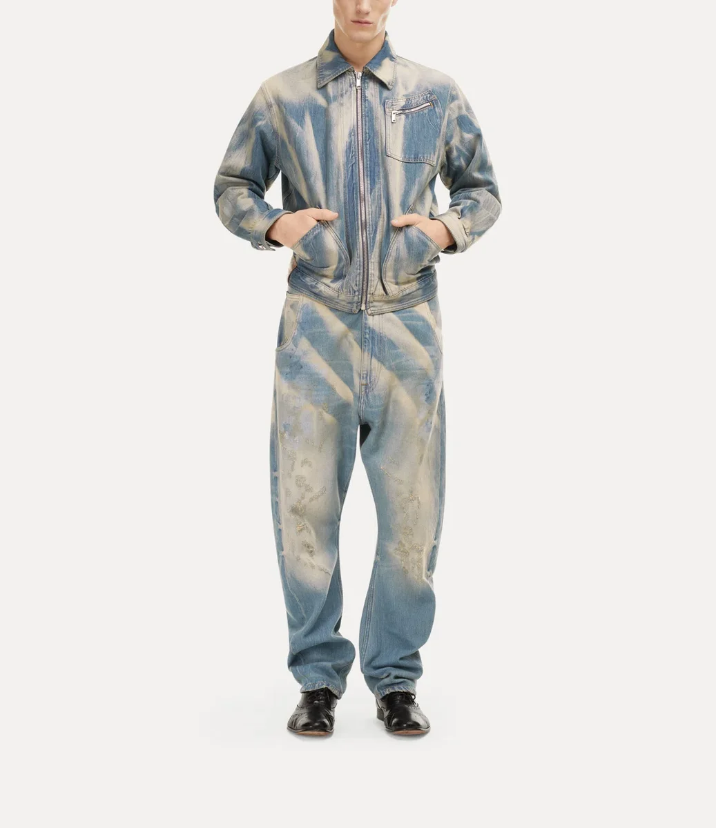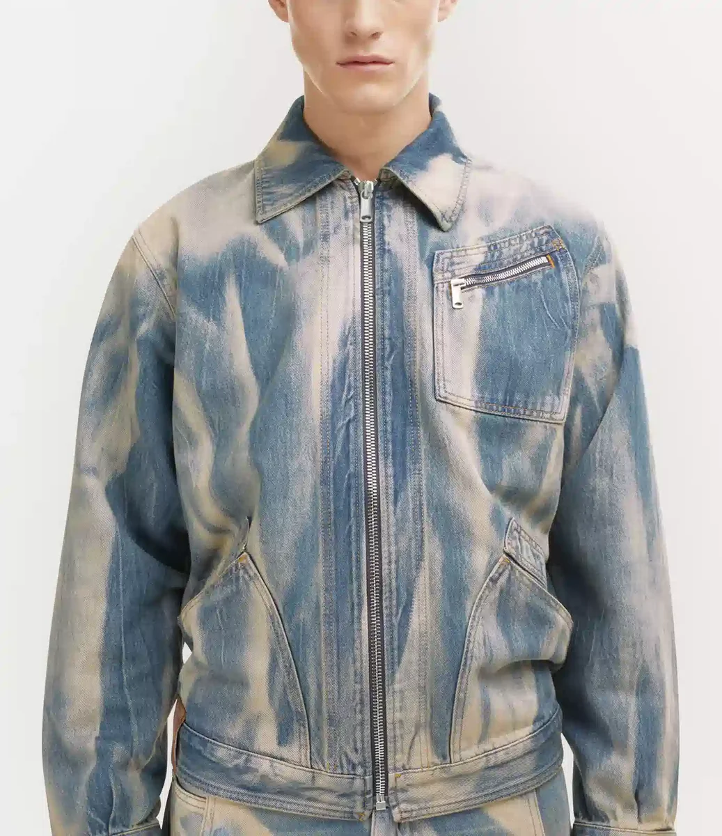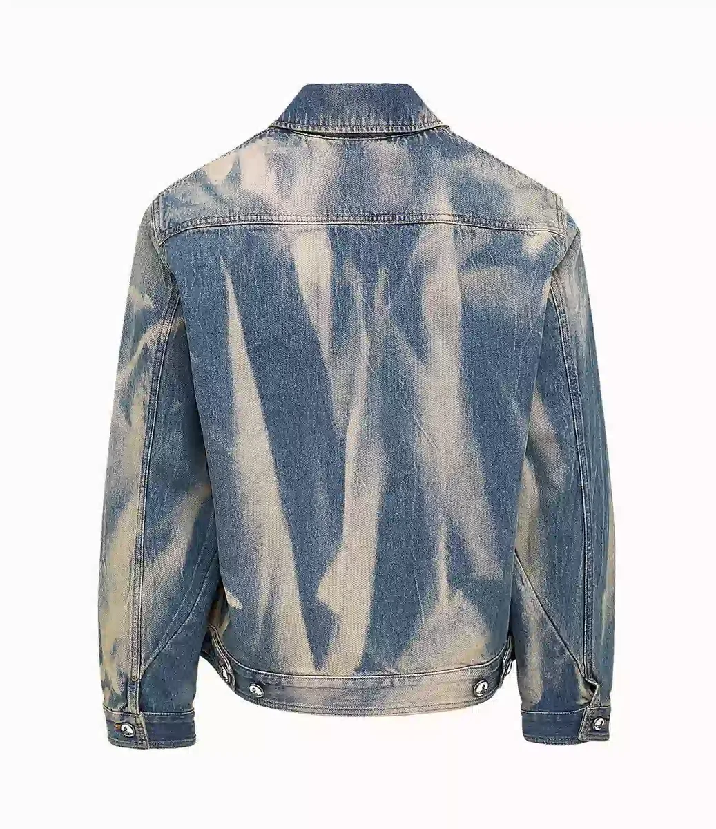 Nuestra chaqueta Piranha presenta un perfil de algodón, adornado con un lavado índigo descolorido para un acabado desgastado. La prenda ofrece un cuello clásico en punta para un escote estructurado, con un cierre de cremallera frontal acentuado con el tirador de cremallera con el emblema de la casa.