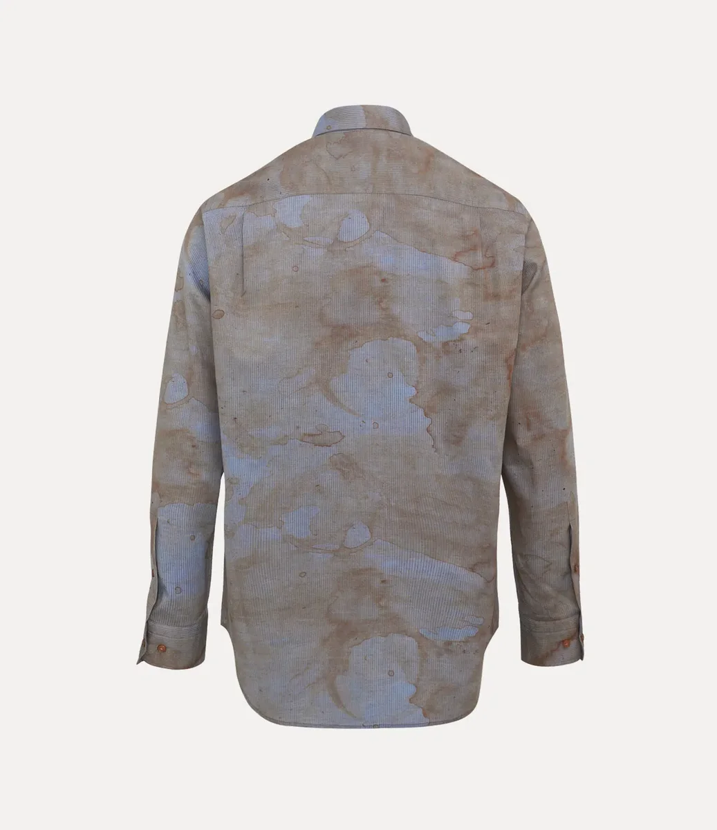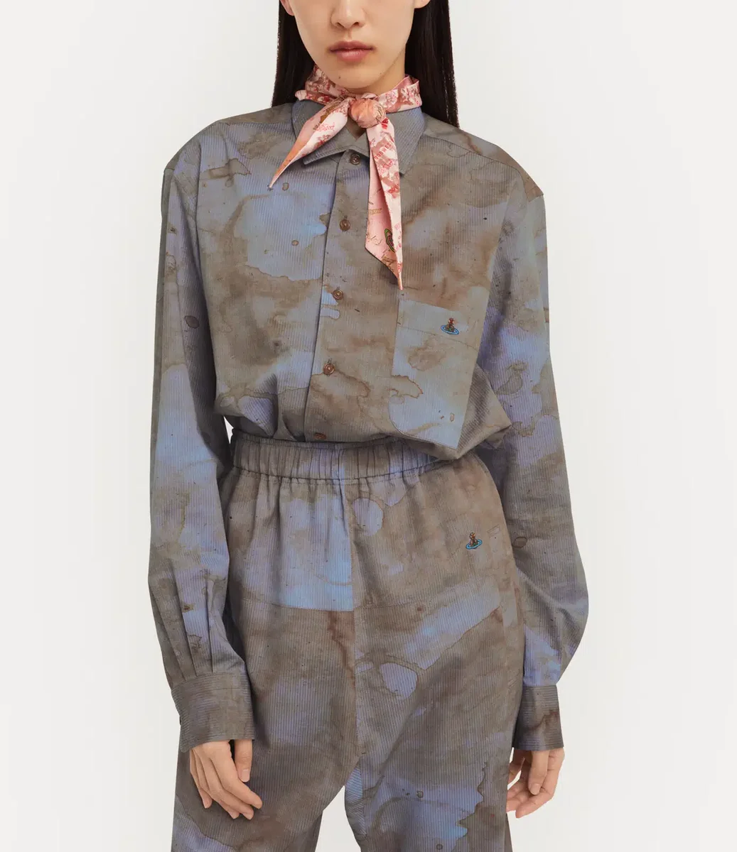Nuestra camisa PJ está adornada con detalles pintados a mano, que recuerdan el aspecto pictórico de los estampados «Grass Stain» y «Wine Stain» del archivo de la casa. Con cuello en punta y botones en la parte delantera, la silueta se completa con un bolsillo en el pecho, bordado con el emblemático emblema del orbe.
