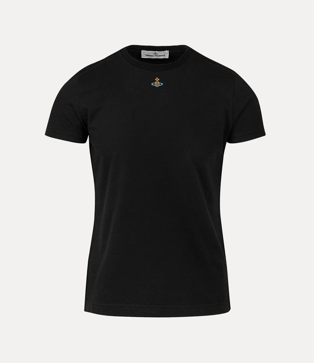 Nuestra camiseta Orb Peru, con mangas cortas y ribetes acanalados, presenta un cuello redondo. El bordado del pecho está inspirado en nuestro motivo Orb, creado por Vivienne Westwood en la década de 1980 para simbolizar la transmisión de la tradición al futuro.