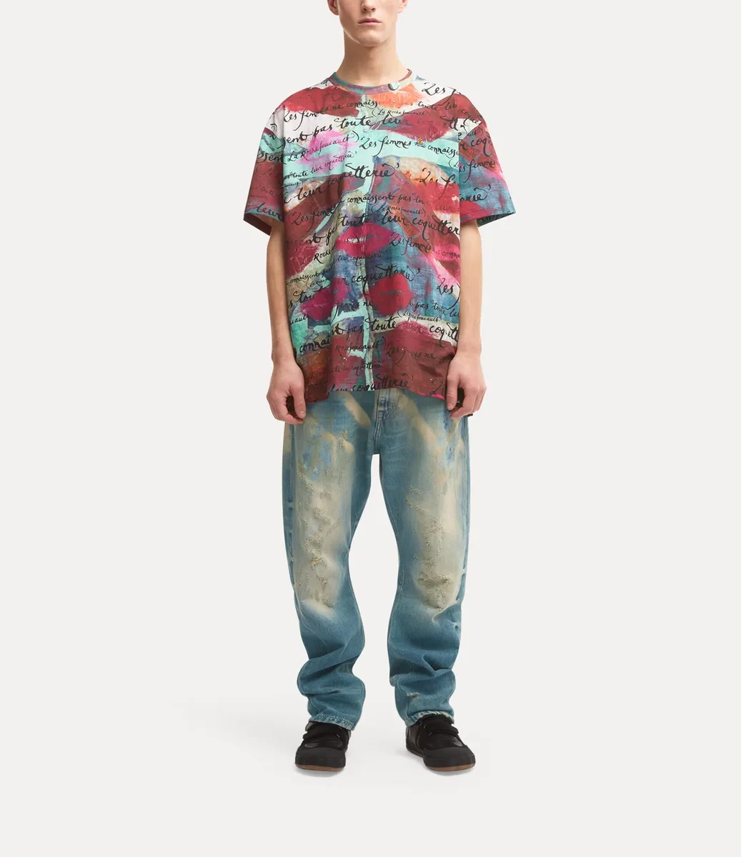 Nuestra emblemática camiseta oversize se ha rediseñado esta temporada con la frase impresa «Les Femmes Ne Connaissent Pas Toute Leur Coquetterie», que adorna el diseño y recuerda la admiración de Vivienne por la literatura. El modelo presenta el diseño «Lipstick Kisses», inspirado en el envase del perfume «Boudoir» de la casa.