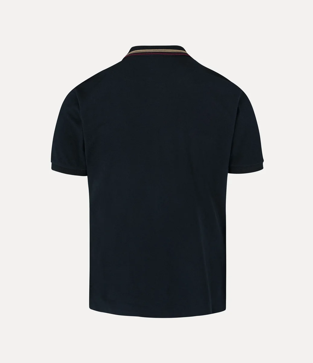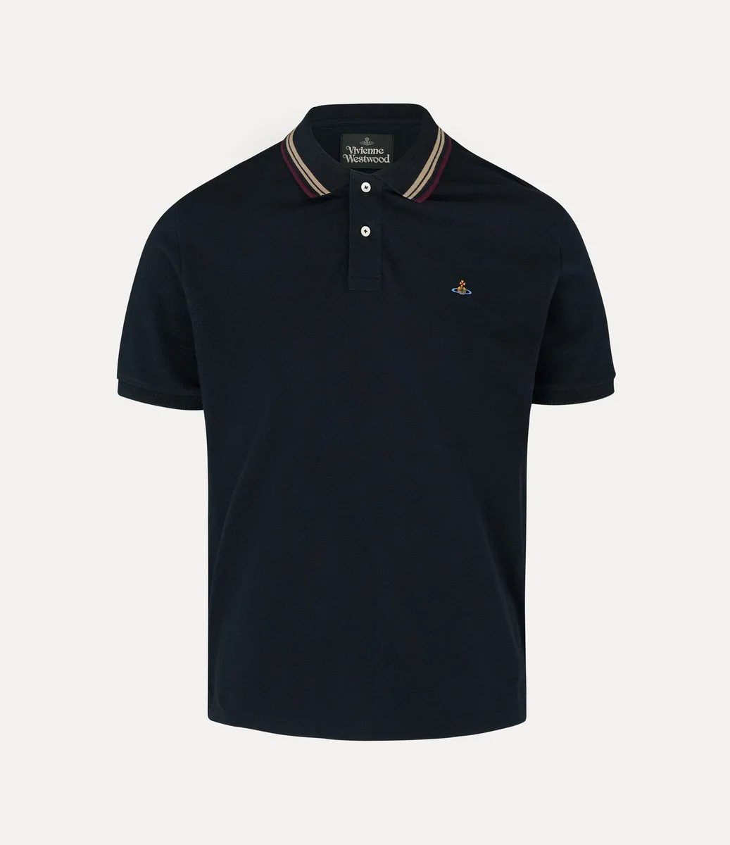 Nuestro polo clásico se ha rediseñado esta temporada con brillantes botones de nácar y detalles a rayas en el cuello. Confeccionada en suave algodón, la prenda presenta un motivo bordado en forma de orbe en el lado izquierdo del pecho, que simboliza la tradición, rodeado por los anillos celestes de Saturno, que representan el futuro.