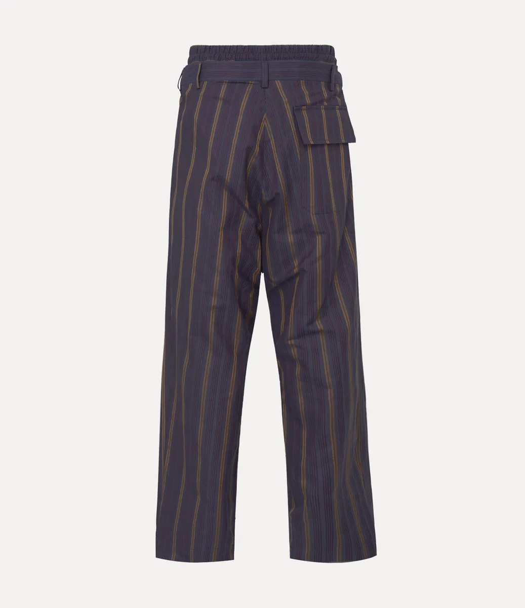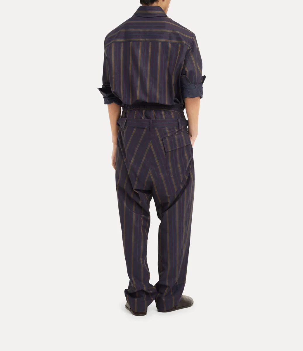 Nuestros pantalones Builder regresan esta temporada con un acabado de algodón a rayas y un detalle bordado en la cadera. Con una distintiva doble cintura, el diseño emplea el sistema de sastrería experimental «Builder» de Vivienne, presentado por primera vez en la colección Otoño-Invierno 2014-15, «Save the Rainforest».