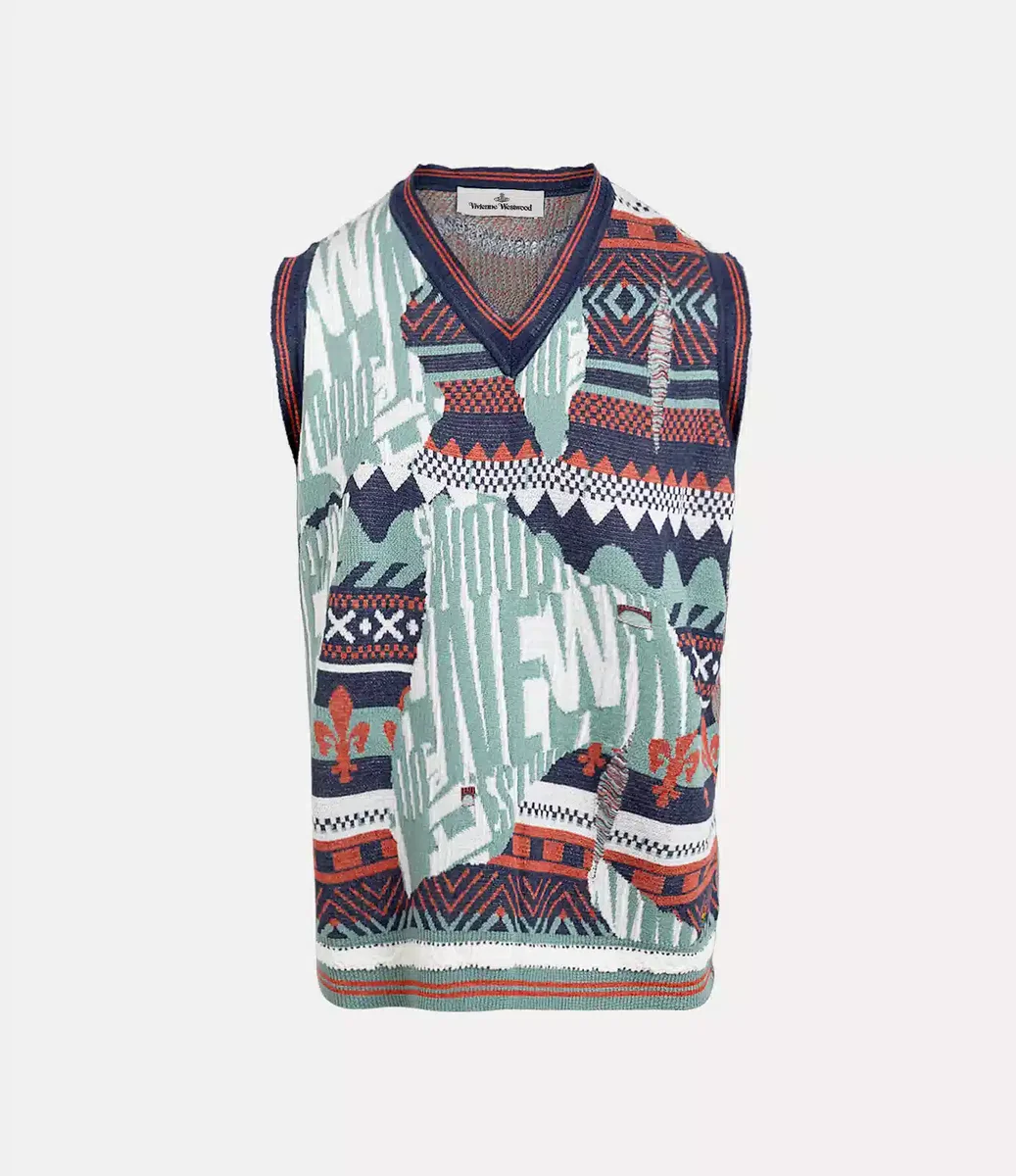 El chaleco Broken Fair Isle presenta el jacquard de esta temporada, incorporando la iconografía característica de la casa y secciones descoloridas donde aparece sutilmente el clásico motivo con las letras «Vivienne Westwood». La prenda ofrece detalles desgastados, incluyendo agujeros colocados esporádicamente, para crear la ilusión de un efecto desestructurado y usado.