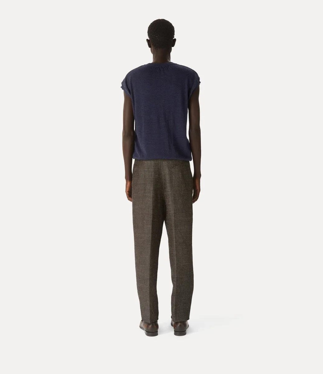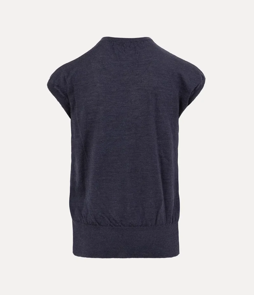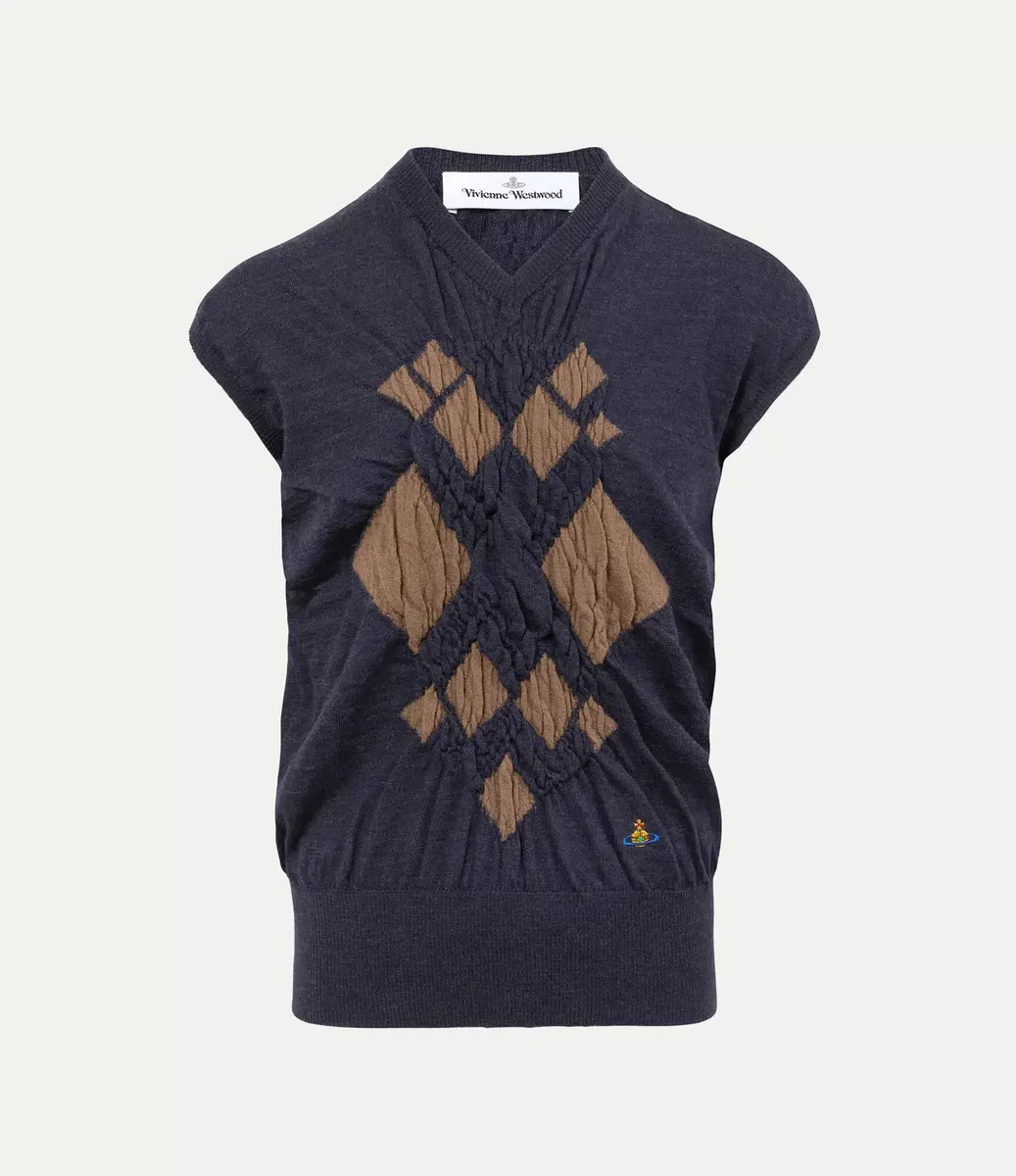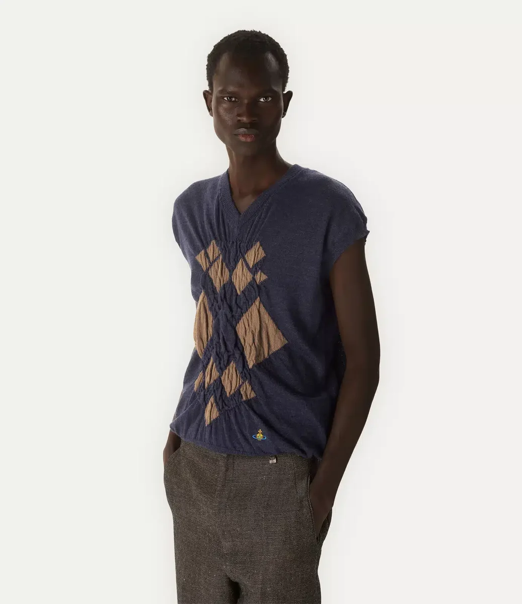 Nuestro chaleco Greg está confeccionado en jacquard de mezcla de lana con motivos de rombos en contraste, que se vieron por primera vez en el desfile Primavera-Verano 2024 de Andreas Kronthaler para Vivienne Westwood. La prenda presenta una estructura arrugada natural en el tejido, con un dobladillo acanalado y un delicado detalle bordado en forma de esfera.