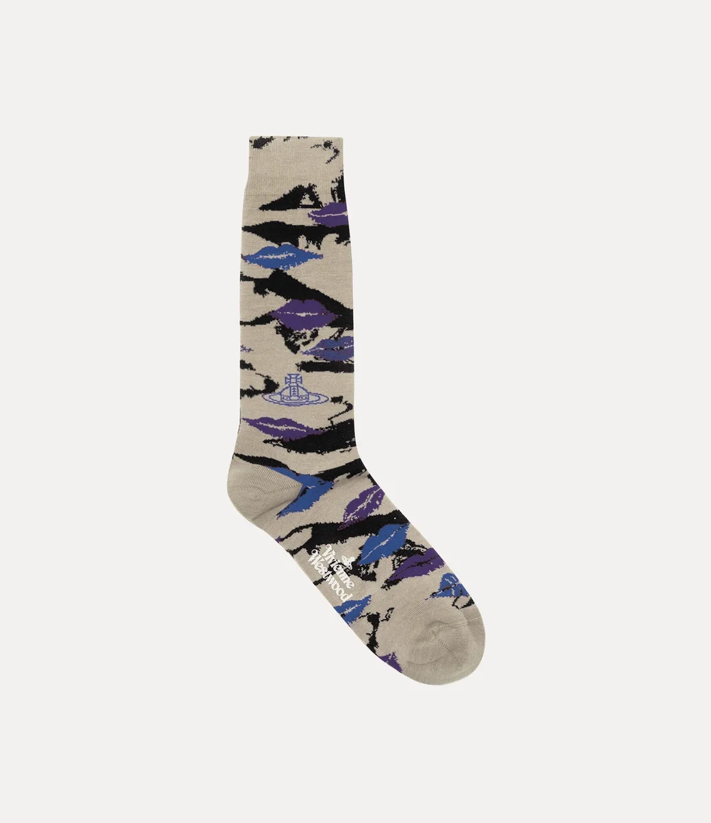 Nuestros calcetines presentan una base de jacquard tejido, superpuesta con el diseño «Kisses» del pintalabios, que apareció por primera vez en el envase del perfume Boudoir de la casa, para crear un patrón de camuflaje abstracto. Confeccionados con una suave mezcla de algodón, la pieza ofrece el motivo orbital característico en los laterales.