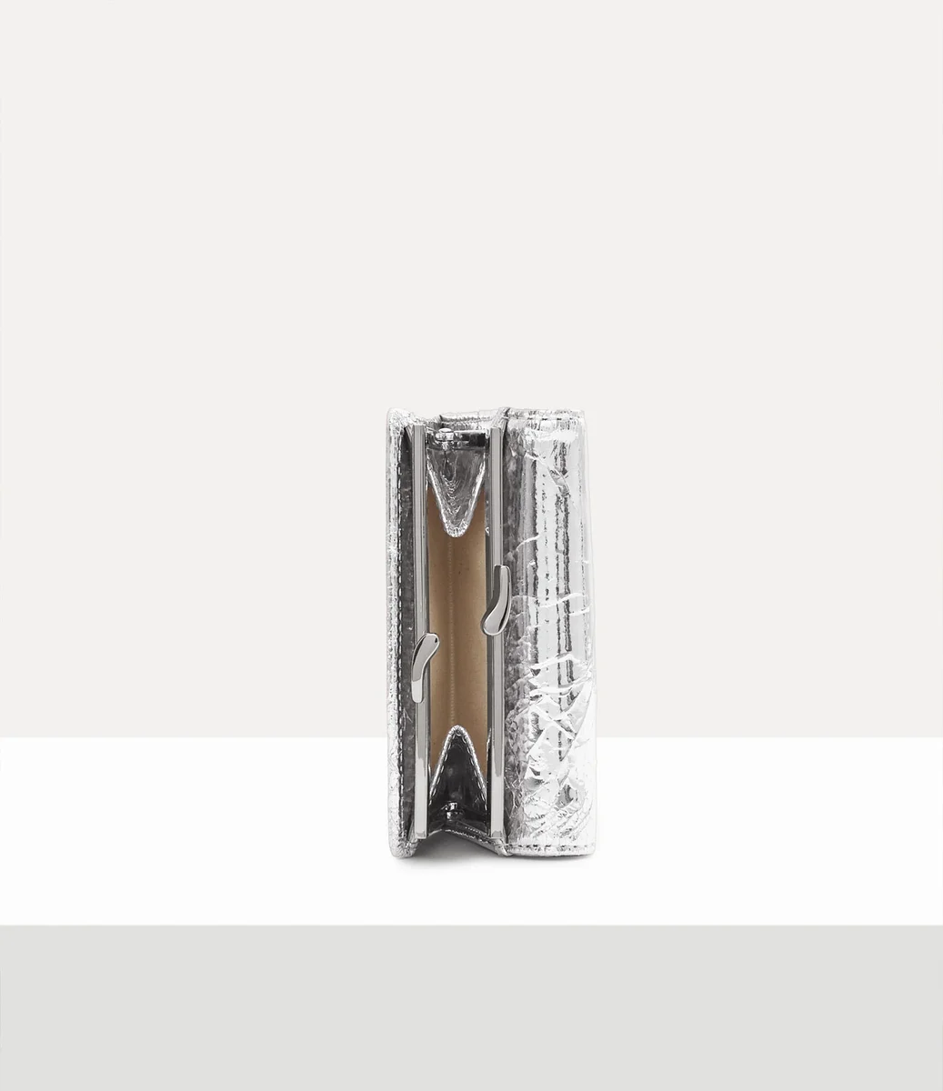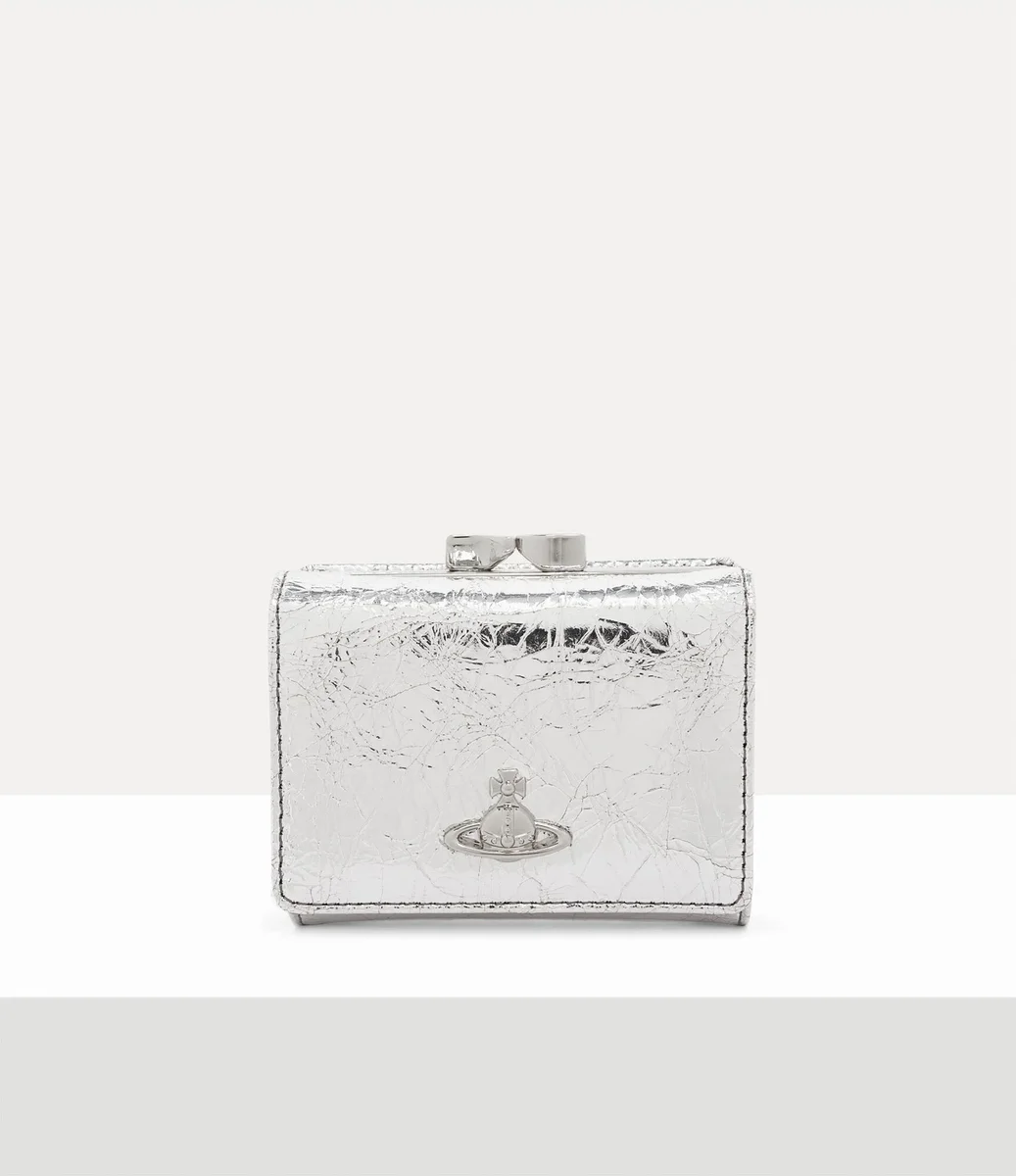 Nuestra cartera Small Frame presenta esta temporada un diseño de piel metalizada con efecto arrugado, inspirado en el rico archivo de la casa. La cartera ofrece un interior organizado y está adornada con nuestro motivo de esfera en bajorrelieve en la parte delantera, que simboliza la filosofía de lanzar el pasado hacia el futuro.
