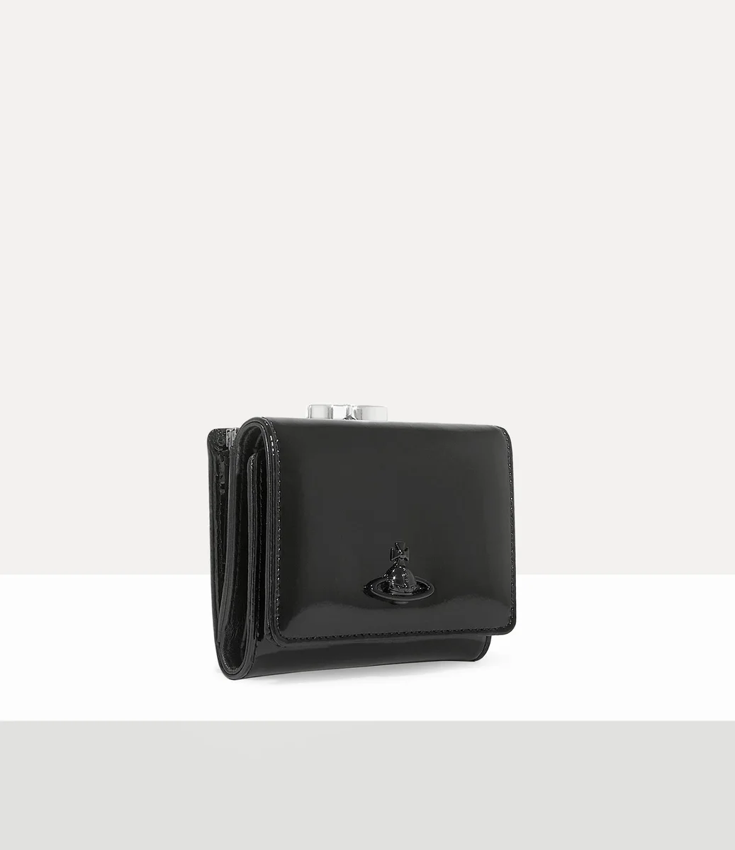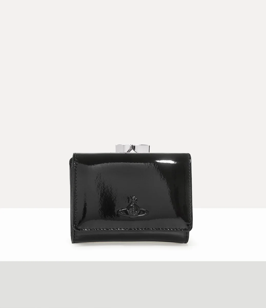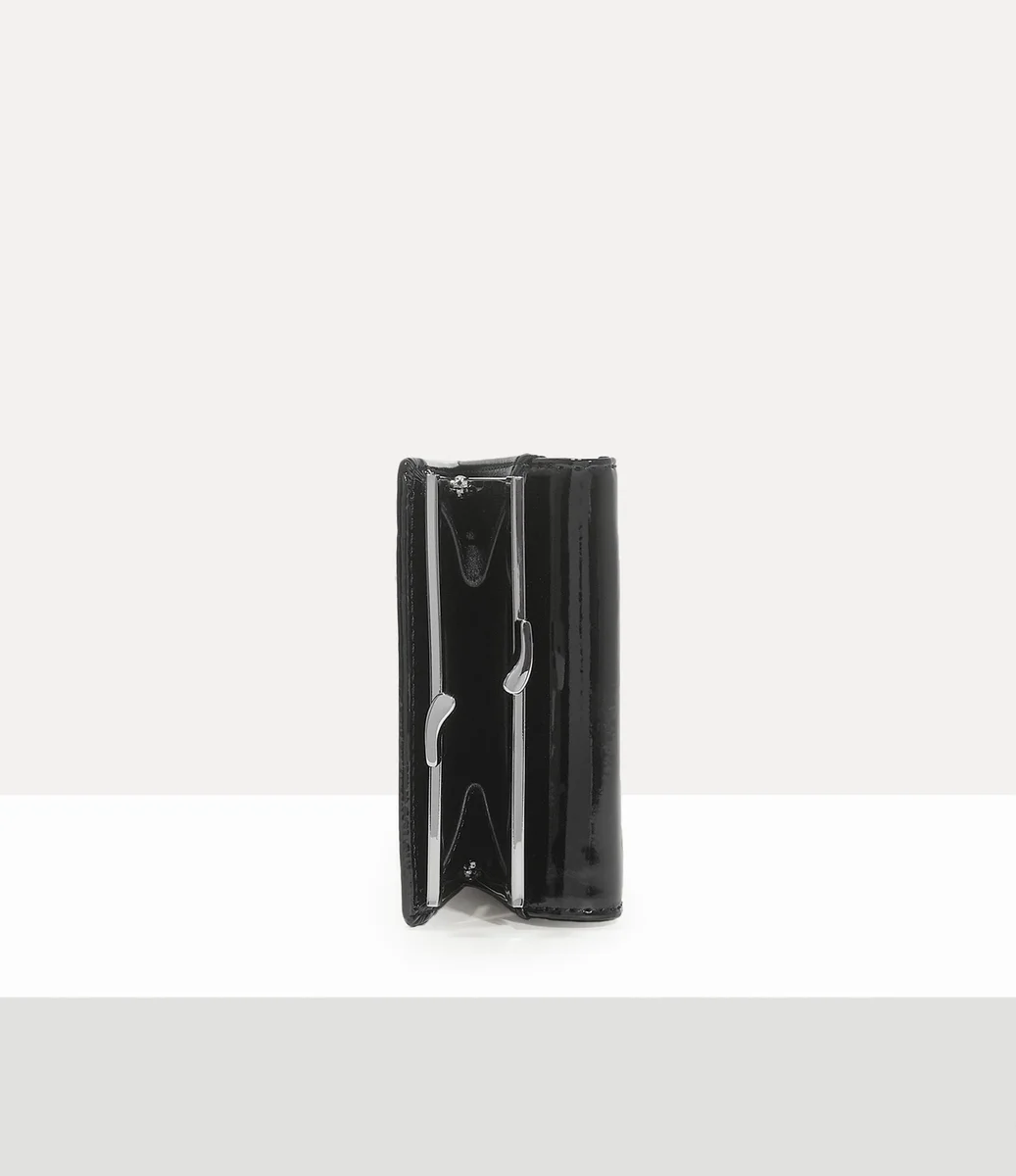 Nuestra cartera pequeña con marco presenta una silueta de cuero con tres pliegues, adornada con una placa con el motivo del orbe en bajorrelieve en tono similar, que personifica la visión de Vivienne de lanzar la tradición hacia el futuro. El acabado patentado, que recuerda al látex líquido y la ropa de goma de nuestra icónica boutique Sex, evoca la estética punk característica de nuestra casa.