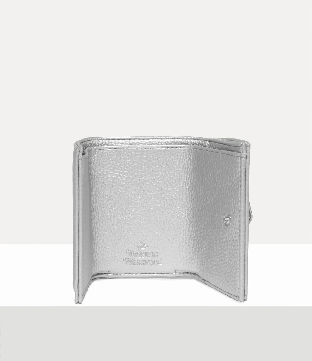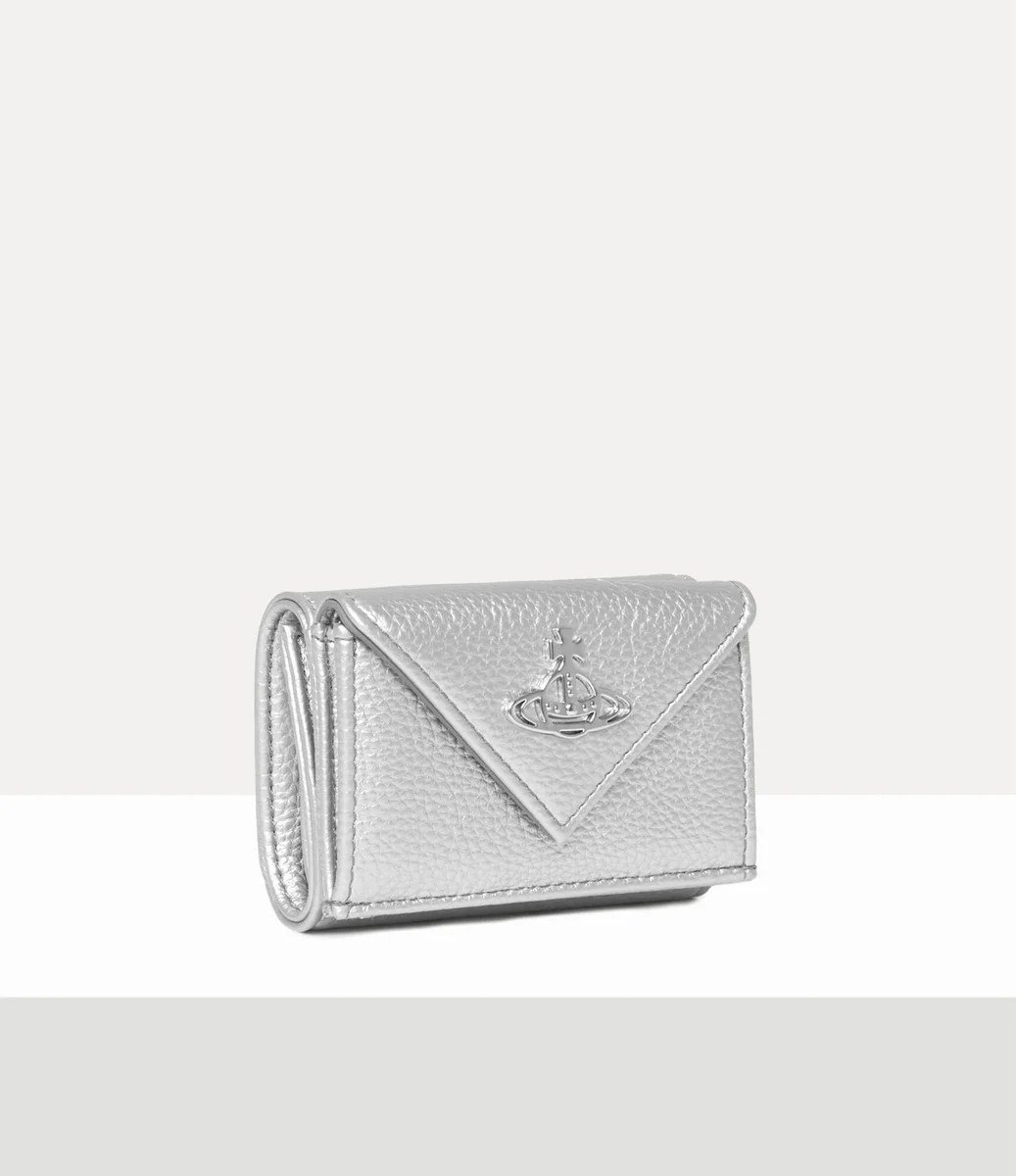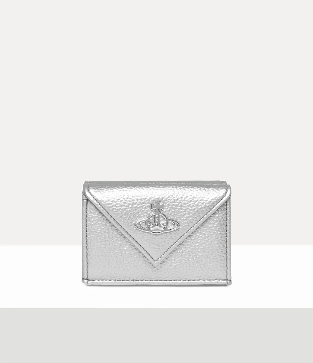 Nuestra cartera tipo sobre presenta una silueta de PU plateada, con un acabado granulado en relieve de esta temporada. El diseño ofrece el motivo metálico «Line Orb», característico de la casa, en el cierre de botón a presión, que encarna la visión de Vivienne de impulsar la tradición hacia el futuro.