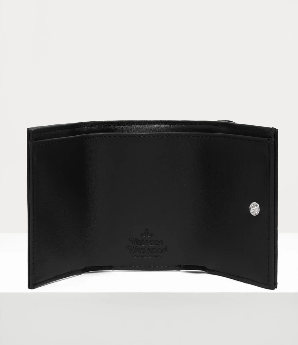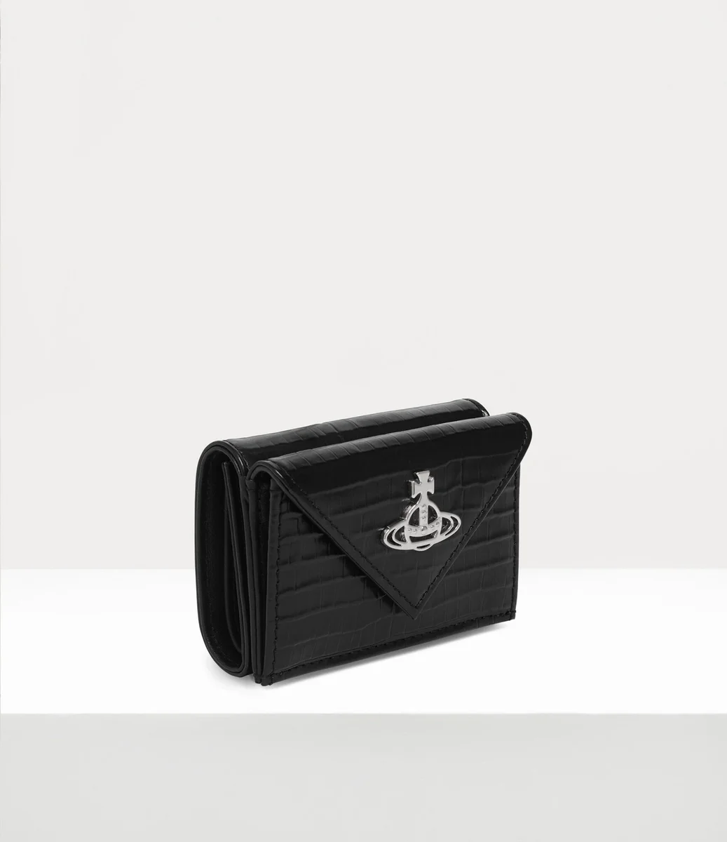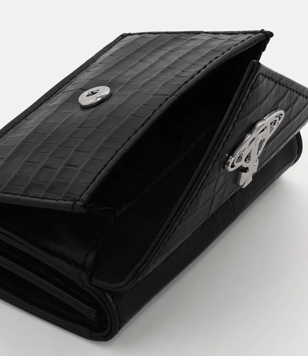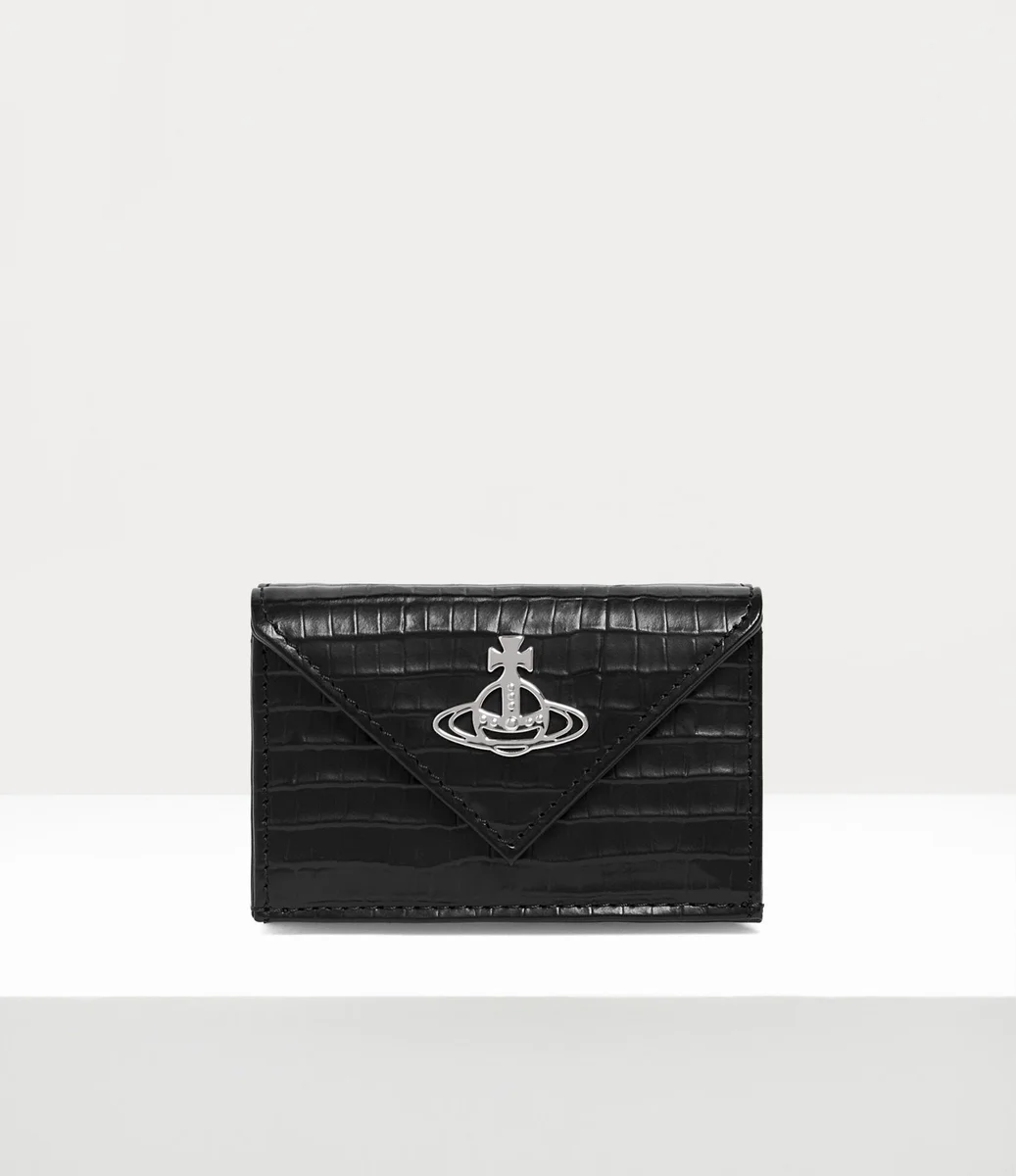 Nuestra cartera tipo sobre se reinventa en el cuero con relieve efecto cocodrilo mini de esta temporada. Acabada con el motivo metálico «Line orb», característico de la casa, en el cierre de botón a presión, la pieza encarna la visión de Vivienne de impulsar la tradición hacia el futuro.