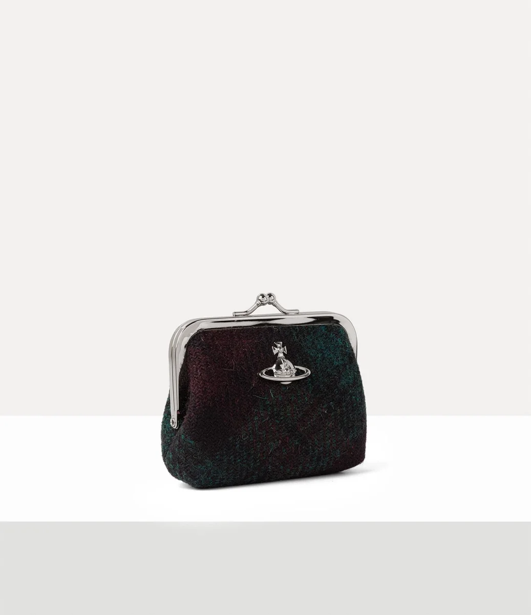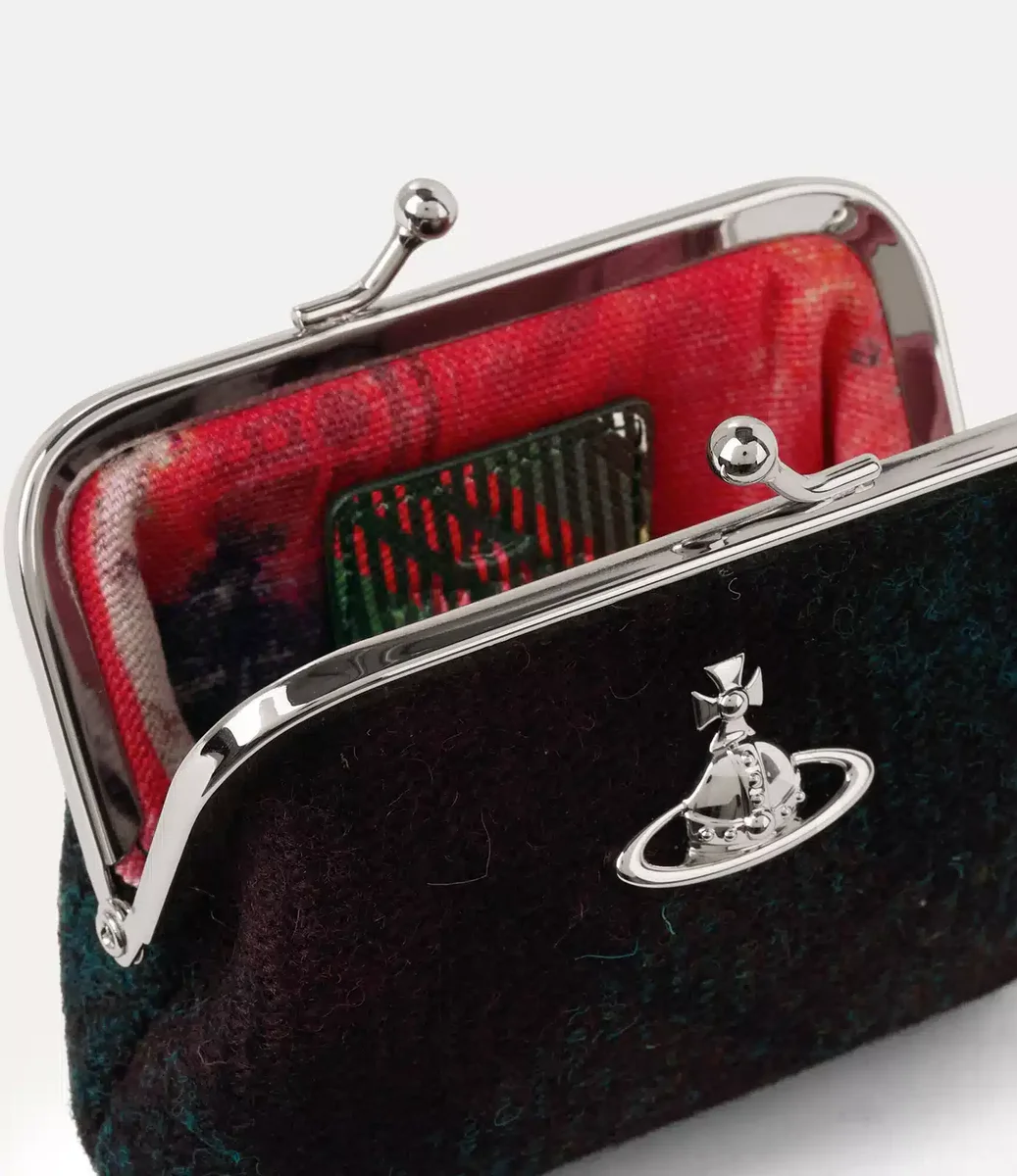 Nuestro monedero con marco está adornado con el motivo de cuadros Harris Tweed oscuro de esta temporada, tejido a mano por los habitantes de las islas Hébridas Exteriores y Lewis, en Escocia. Con un marco dorado a la vista y un delicado cierre de presión, el diseño recuerda a los monederos vintage de principios del siglo XX.