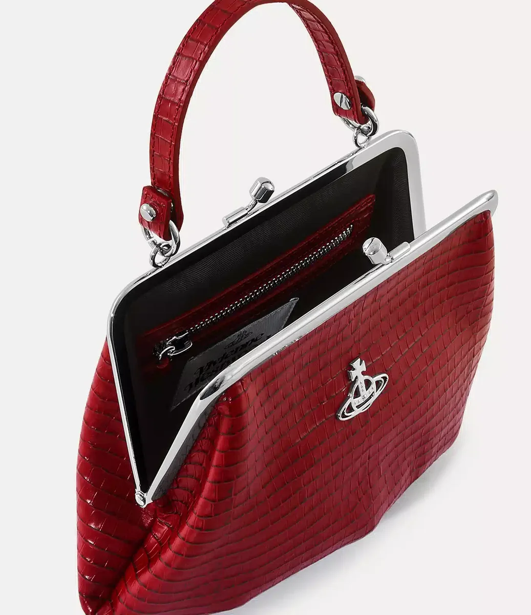 Inspirado en los populares monederos antiguos de principios del siglo XX, nuestro bolso Granny Frame cuenta con un cierre pulido con broche y una estructura metálica expuesta. La pieza ofrece el acabado en relieve con efecto cocodrilo «Mini» de esta temporada, complementado con detalles metálicos clásicos.