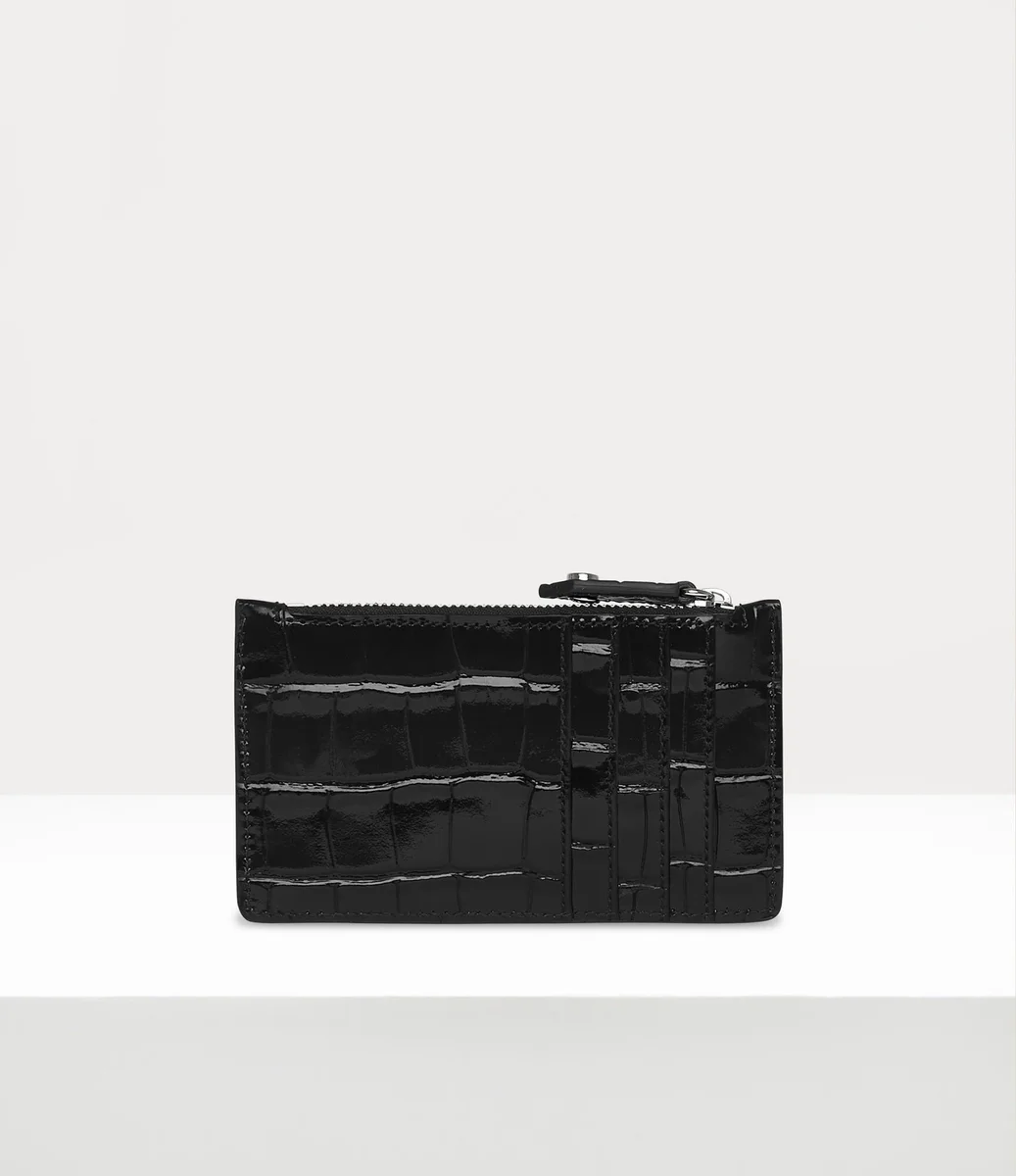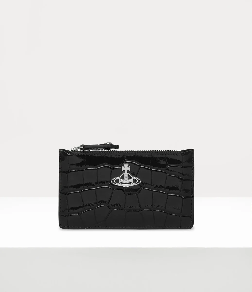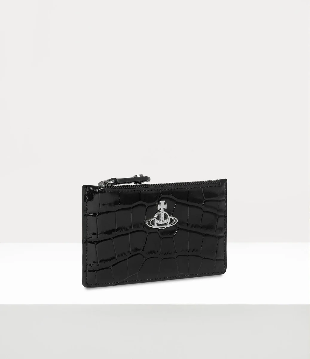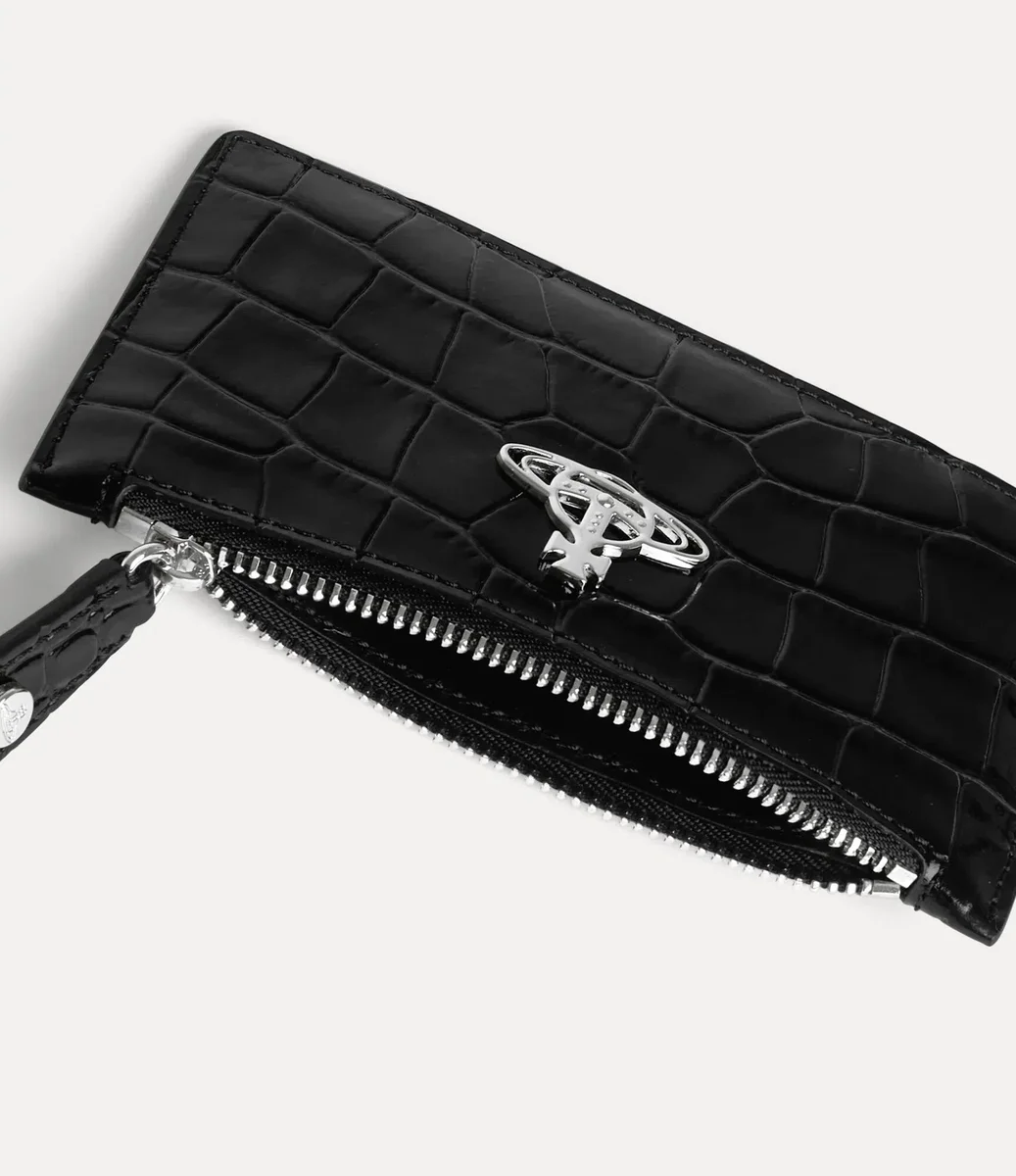 El tarjetero Slim Long está confeccionado en piel con relieve de cocodrilo y cuenta con un cierre de cremallera grabado, cuatro ranuras para tarjetas en la parte trasera y una versión forrada de nuestro orbe en la parte delantera en tonos plateados.