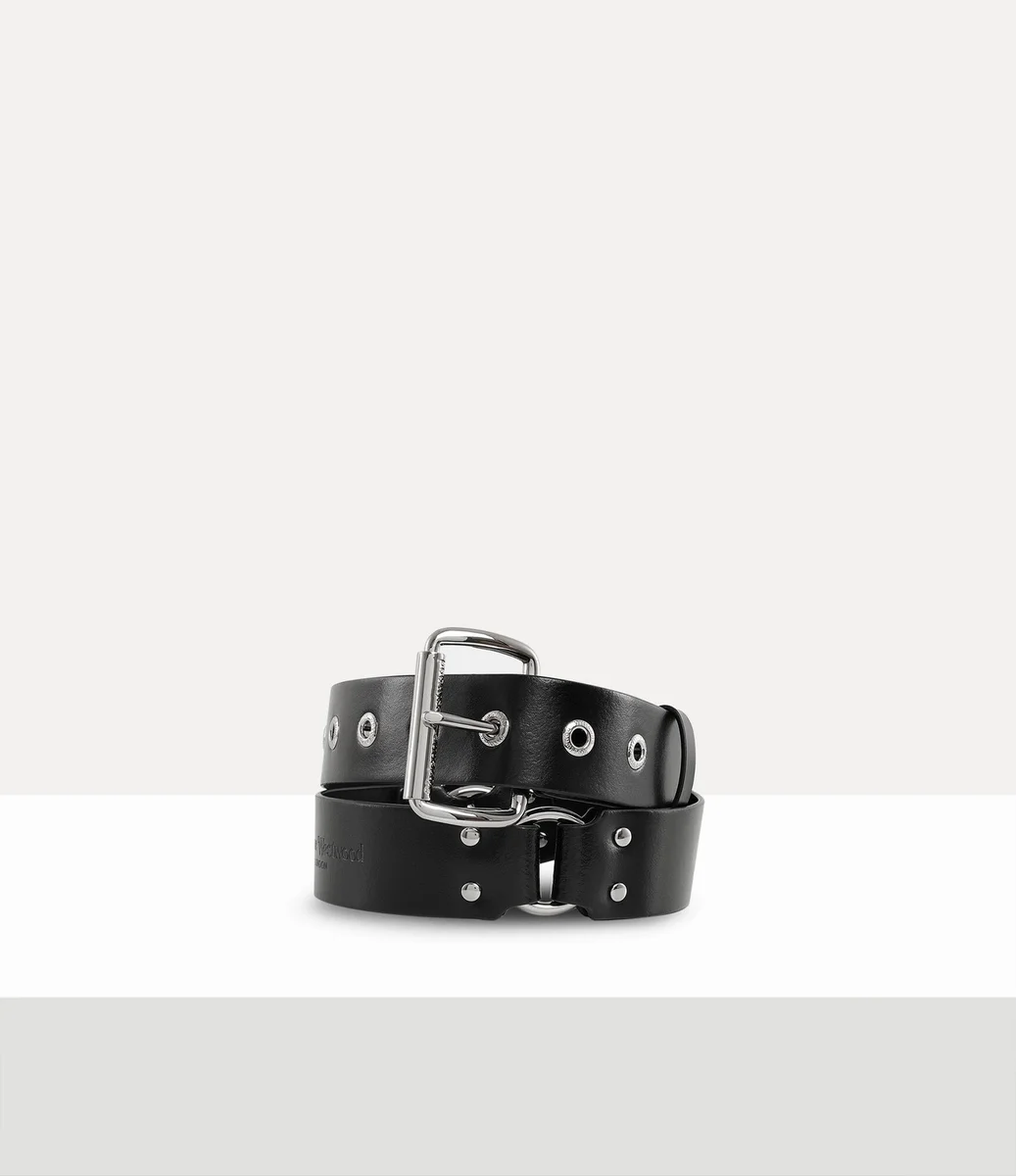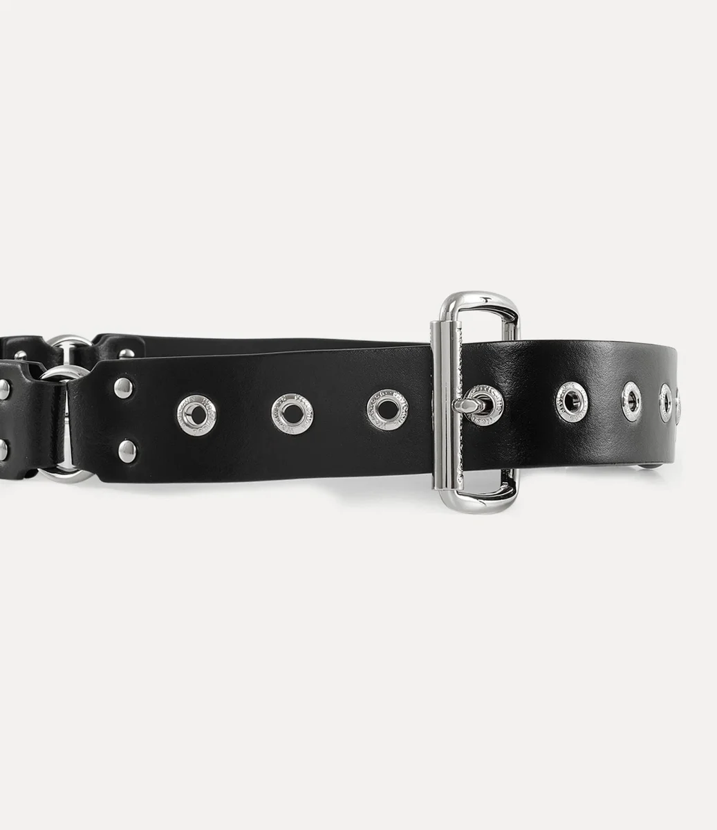 Inspirado en la colección «Erotic Zones» de Vivienne Westwood para la primavera-verano de 1995, este cinturón está adornado con llamativos aros inspirados en el bondage y herrajes metálicos llamativos. Una hebilla pulida completa el diseño, mientras que las letras grabadas decoran los detalles de los ojales.