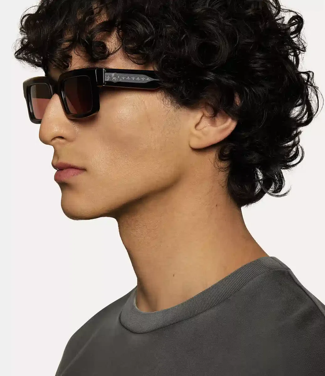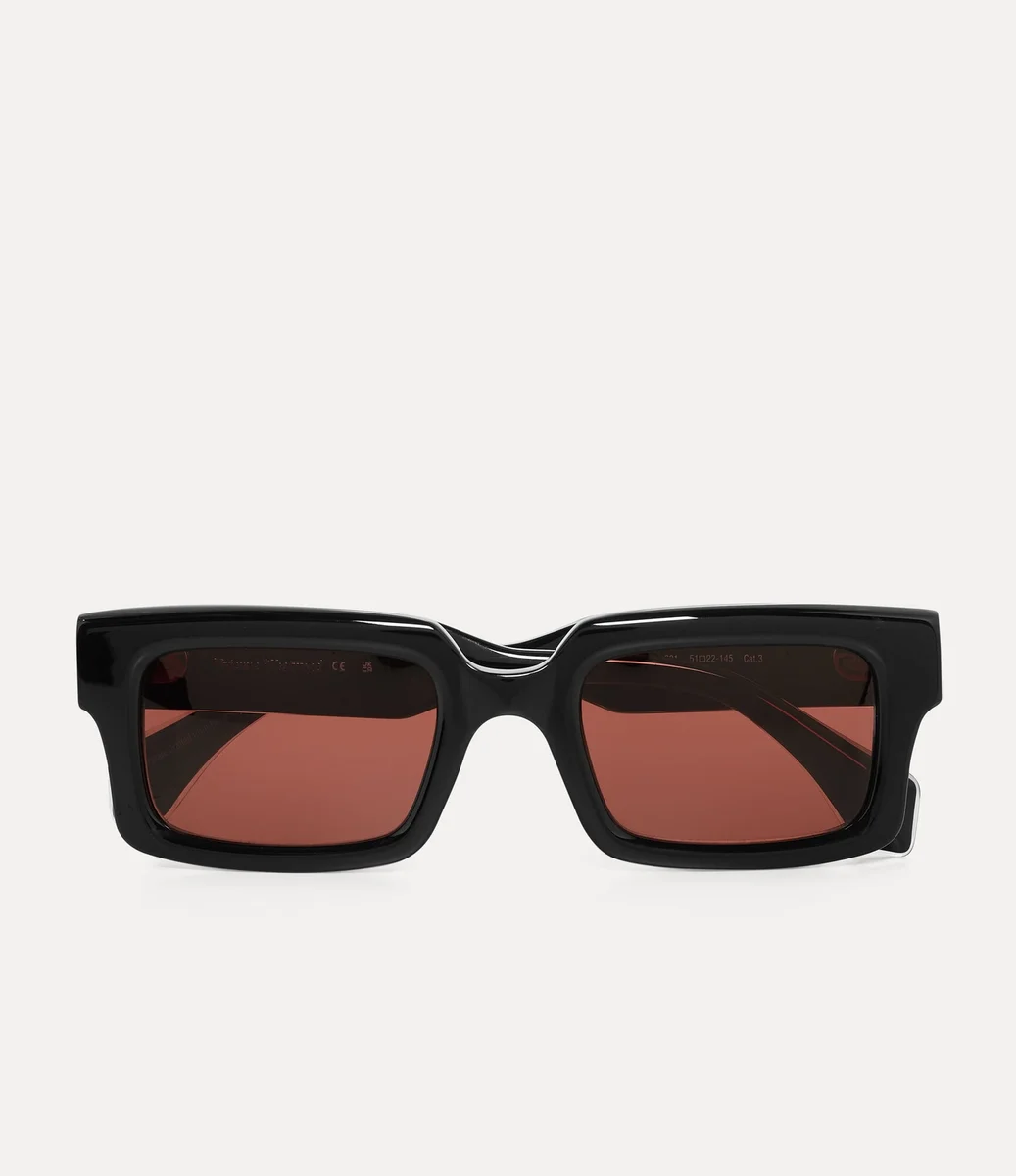 La silueta de las brillantes gafas de sol Costello en negro se inspira en figuras culturales icónicas del teatro y el cine. Con montura cuadrada gruesa y lentes tintadas en marrón, su llamativo diseño se ve realzado por los intrincados detalles en cuerno que adornan el borde exterior, que recuerdan a la icónica diadema Horn Alice de Vivienne. Las patillas esculpidas están adornadas con motivos de esferas en las sienes, mientras que los detalles metálicos personalizados están acabados con grabados de esferas en miniatura.