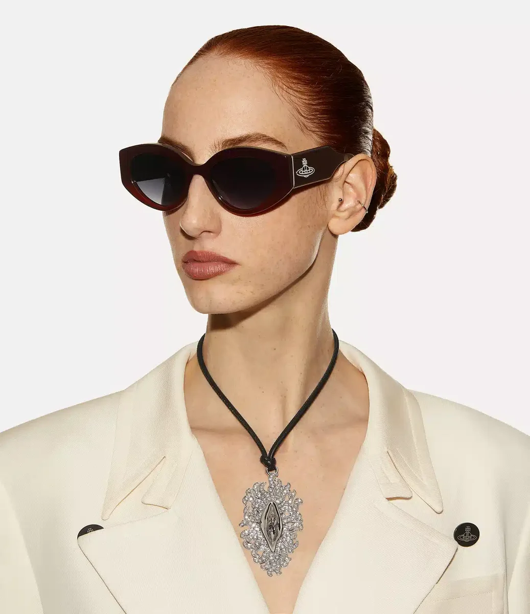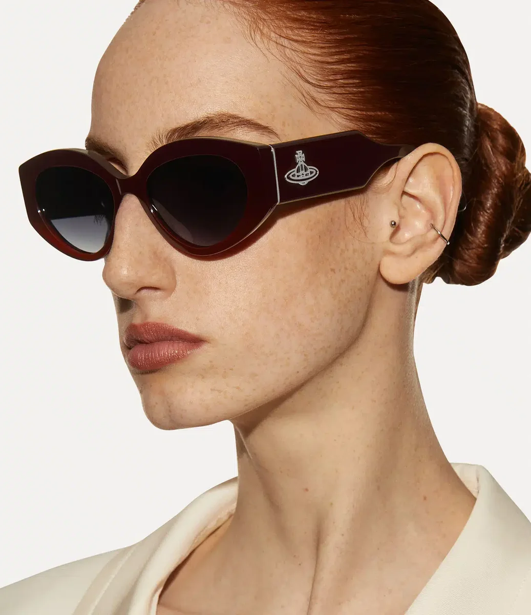Las gafas de sol Jackie presentan una silueta atemporal, inspirada en la fotografía vintage y en los íconos underground de los años 80. Con lentes degradadas con protección UV, el modelo se completa con un orbe metálico bidimensional en las patillas, que encarna la visión de Vivienne de lanzar la tradición hacia el futuro.