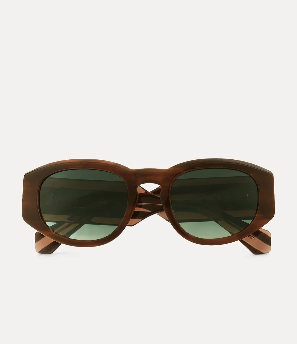 Las gafas de sol Reed presentan una montura ovalada de inspiración vintage con suaves ribetes con efecto cuerno, influenciadas por la fotografía de los años 50 y 60 y los iconos underground de los 80. Equipadas con lentes degradadas con protección UV, la pieza está rematada con una esfera metálica bidimensional en las patillas, que refleja la visión de Vivienne de llevar el pasado al futuro.