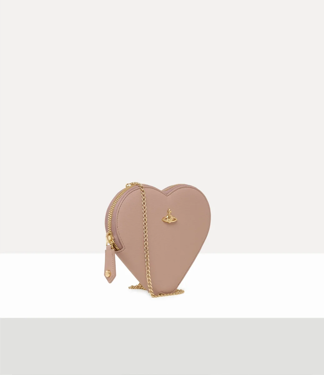 El bolso New Heart Crossbody tiene una silueta en forma de corazón, que recuerda el afecto de Vivienne por la humanidad y el planeta. La pieza presenta un motivo de orbe en tono dorado claro en el panel frontal del diseño, que simboliza la tradición, rodeado por los anillos celestes de Saturno, que representan el futuro.