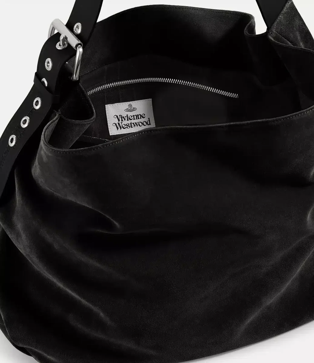 Nuestro bolso bandolera grande Maxime presenta un perfil de piel de ante, con un cierre de hebilla grabada y una fila de ojales plateados a lo largo de la correa para el hombro, que recuerda el diseño del icónico cinturón Alex de la casa. Acabado con un cierre magnético a presión, la pieza ofrece un bolsillo interior con cremallera.