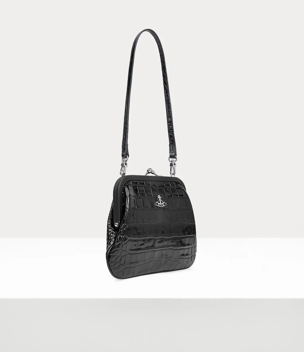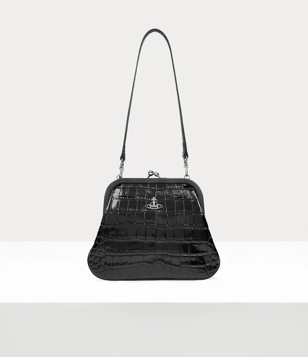 Nuestro bolso de mano Vivienne se presenta en un acabado de piel brillante, con un marco con cierre de beso de inspiración vintage y un relieve con efecto cocodrilo en todo el diseño. La pieza lleva el nombre de Vivienne, a quien le encantaba este estilo, y está adornada con nuestro característico motivo «Line Orb» en el panel frontal.
