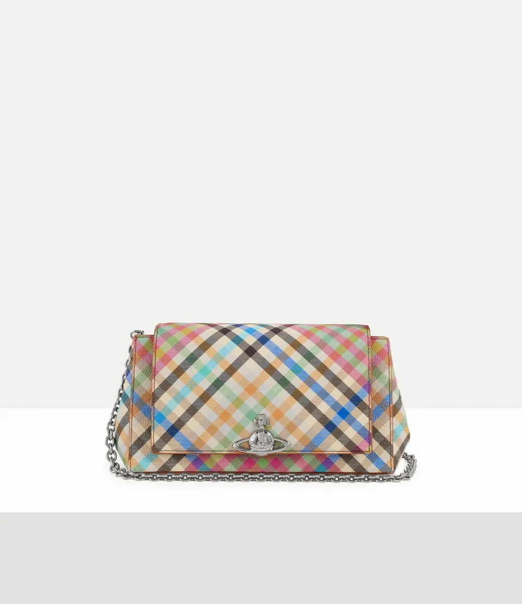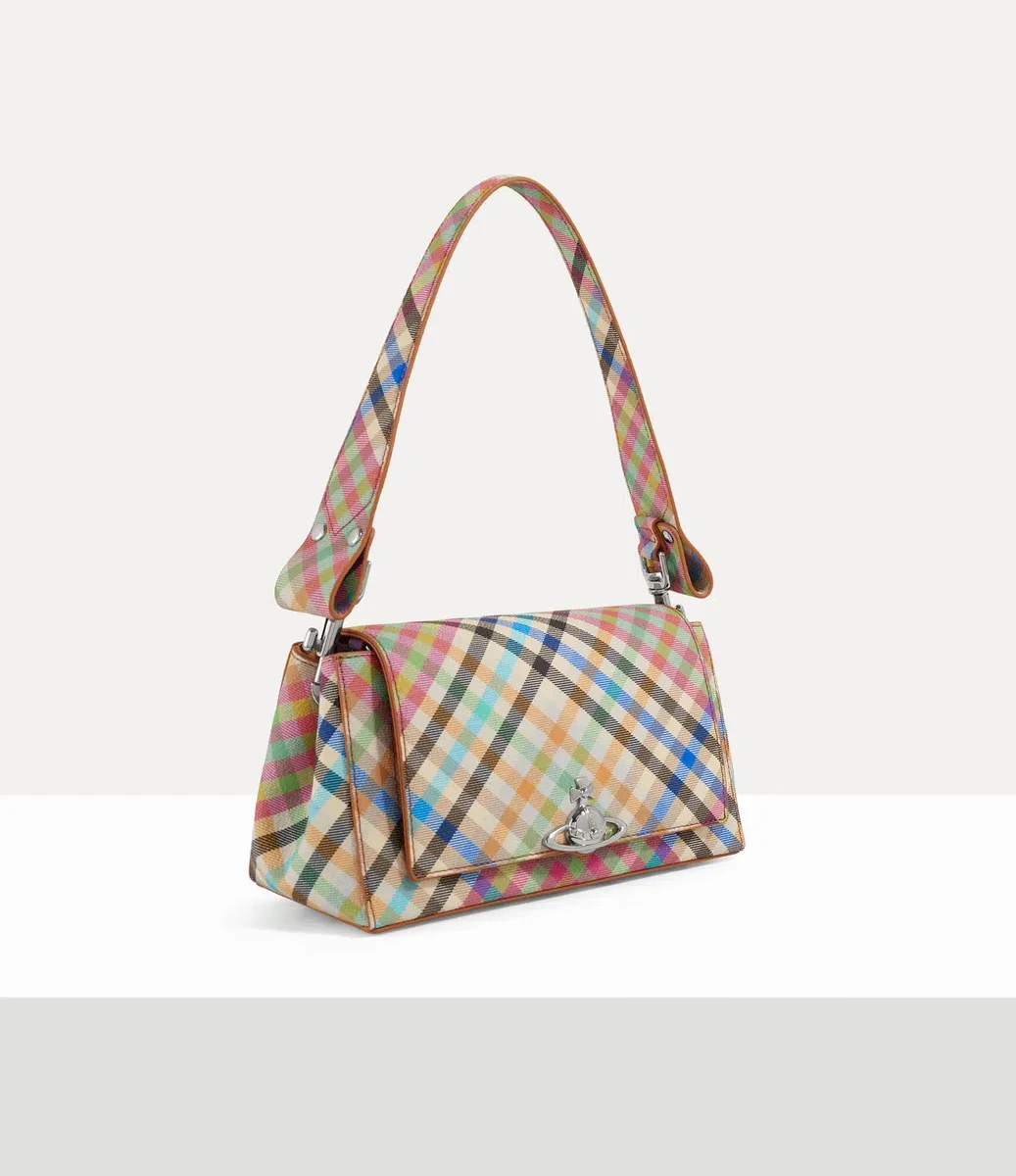El bolso mediano Hazel de Vivienne Westwood, confeccionado en piel sintética, se reinventa esta temporada con el vibrante motivo «Heather Plaid», que presenta un estampado de cuadros multicolor.