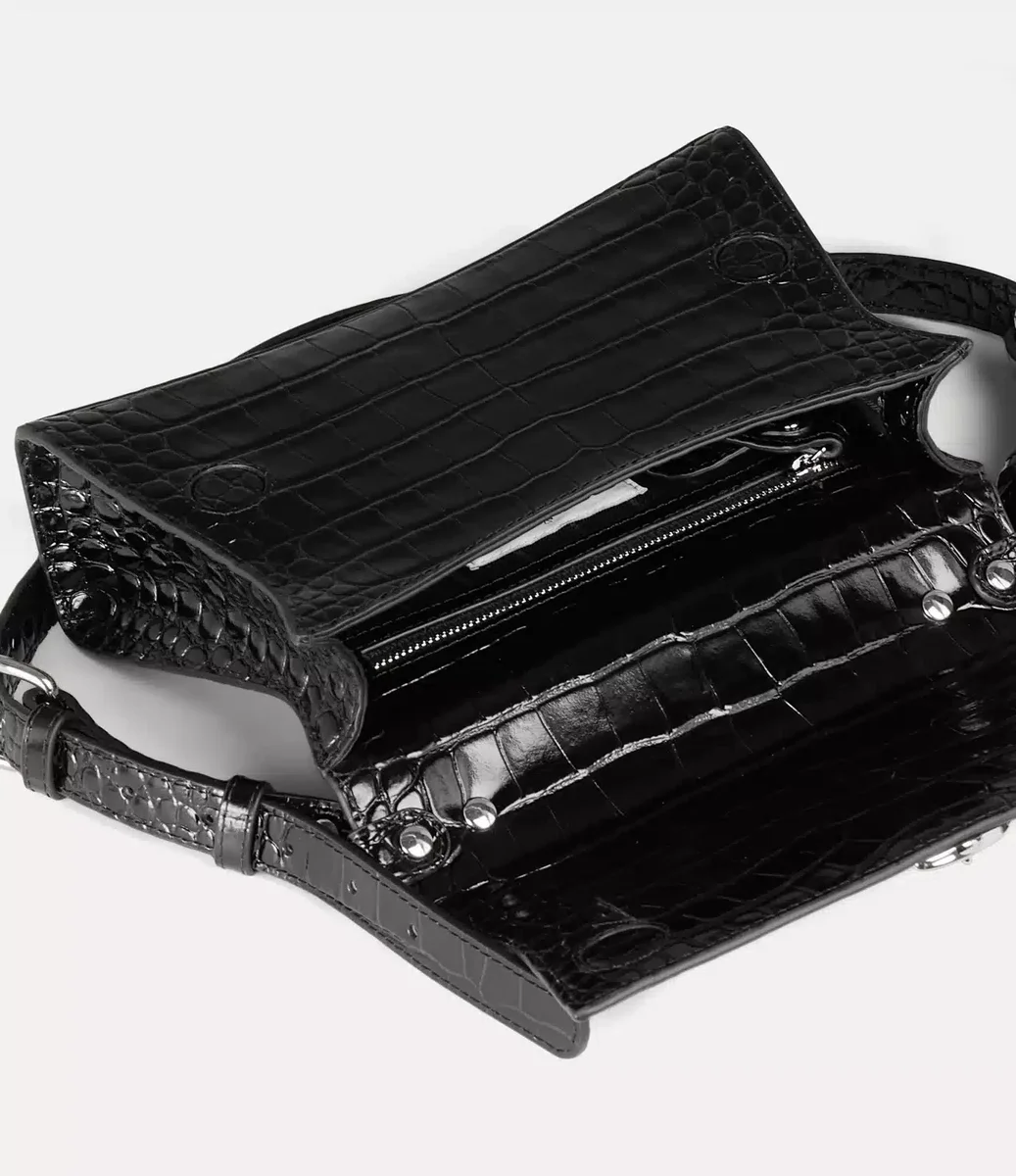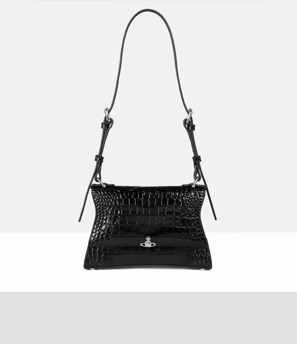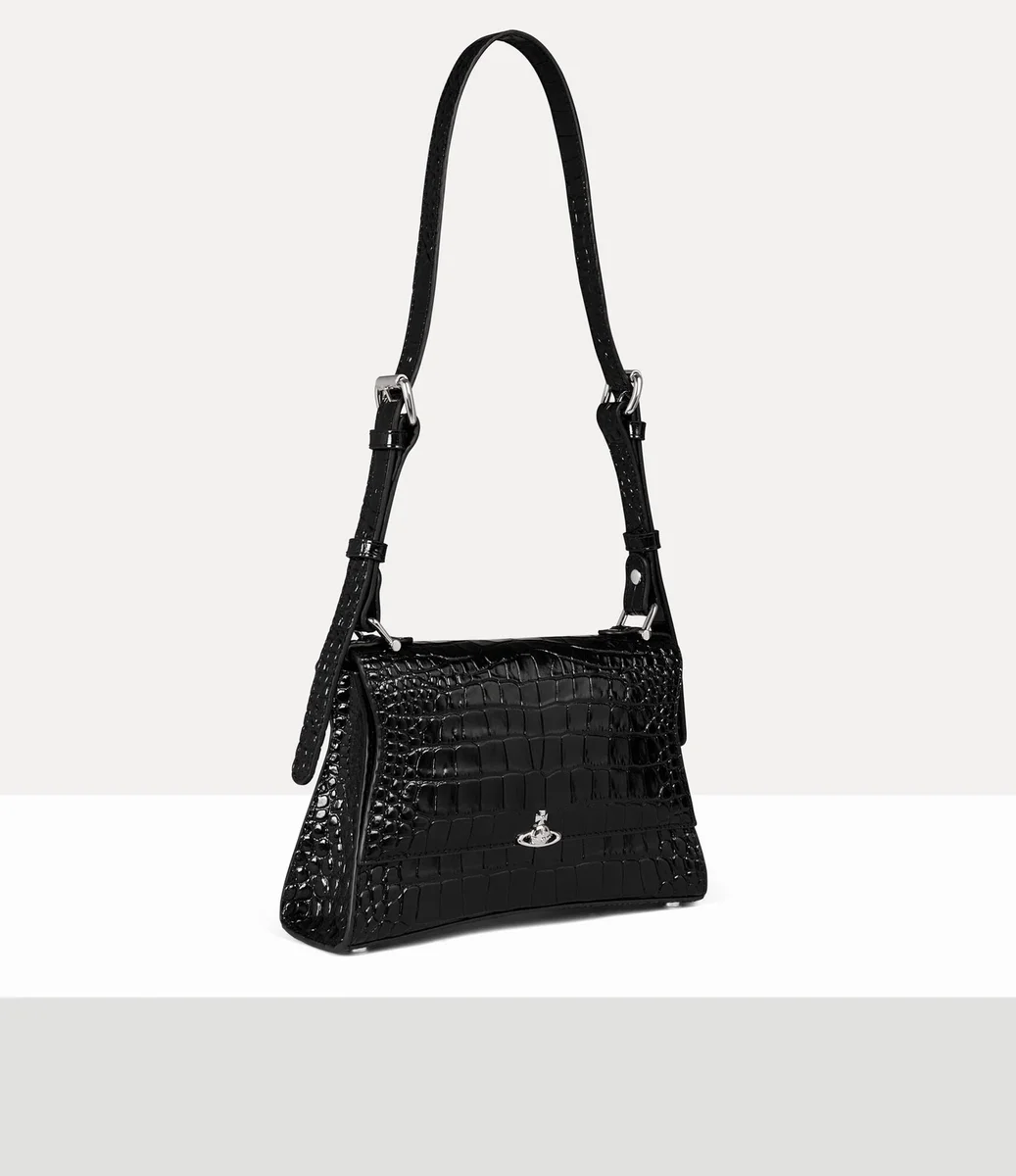 Nuestro bolso pequeño de hombro Bianca se inspira en la silueta clásica de los años 50, cuidadosamente reinterpretada con curvas modernas que hacen un sutil guiño a la icónica gama «Kelly» de la casa. Confeccionado en piel, el diseño presenta un acabado con relieve efecto cocodrilo y una textura brillante de charol, que recuerda al látex líquido y las prendas de goma que se venden en nuestra icónica boutique Sex.