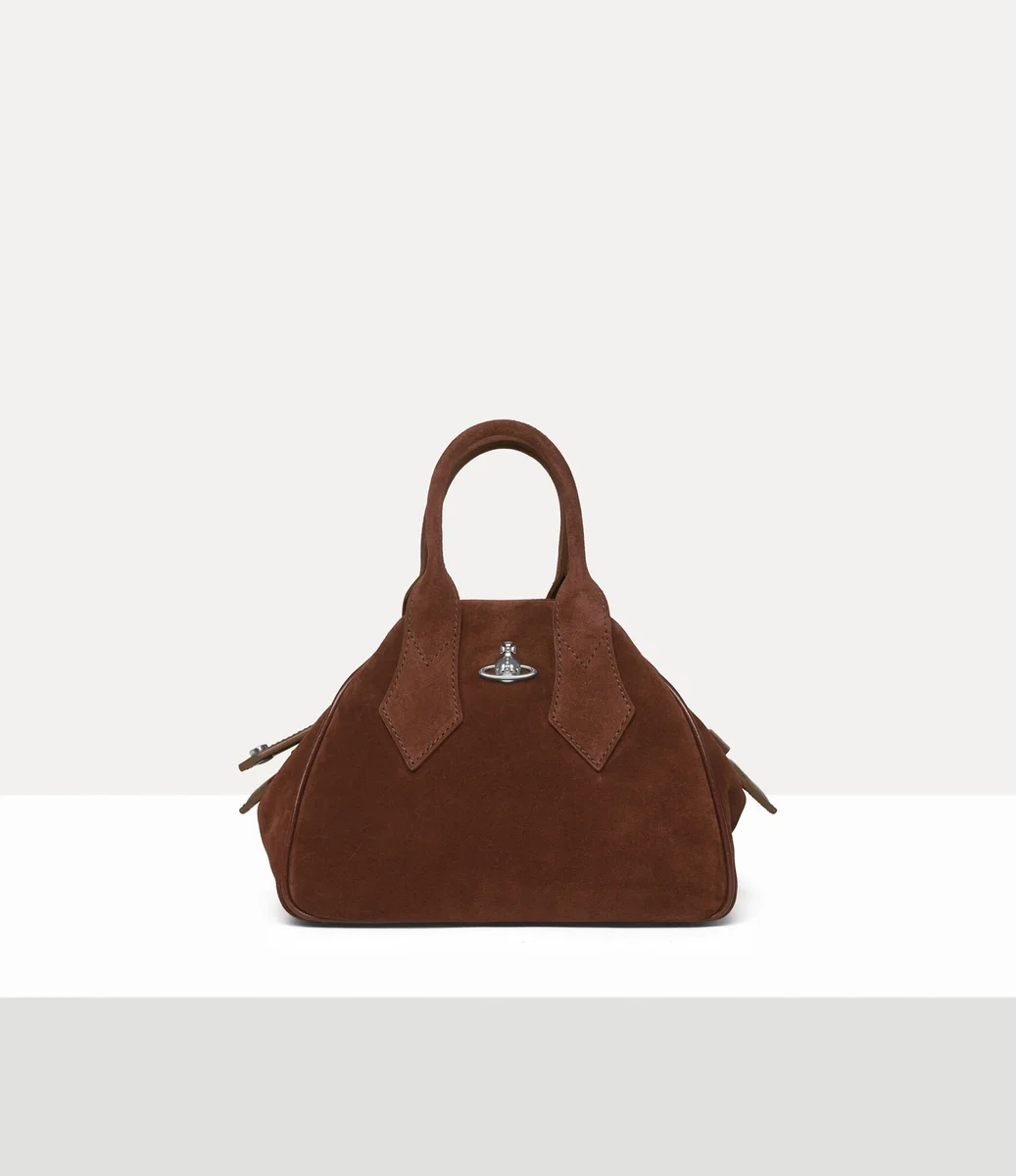 Nuestro bolso Yasmine Small está confeccionado en suave piel de ante y adornado con un brillante motivo de orbe en bajorrelieve en la parte delantera. La pieza cuenta con el forro interior de algodón suave «Broken Pinstripe» de la casa, un giro único al tradicional patrón de rayas, visto por primera vez en la colección Otoño-Invierno 2015 de Vivienne Westwood Gold Label.