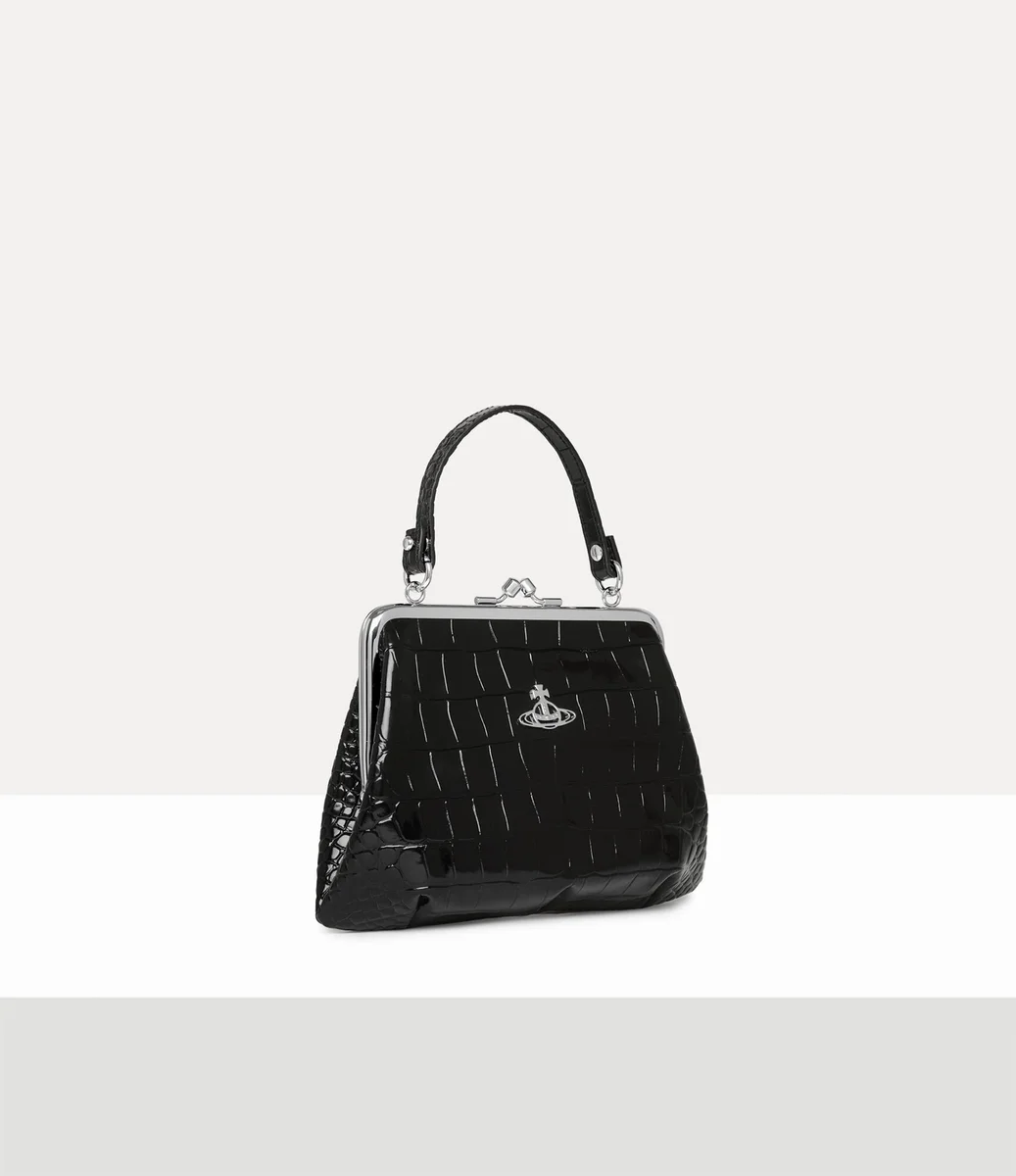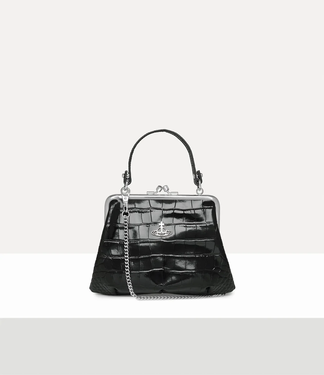 La silueta del bolso Granny Frame recuerda a los antiguos monederos de principios del siglo XX, con una estructura metálica y un cierre de seguridad con broche. La pieza presenta un relieve con efecto cocodrilo en todo el diseño, completado con nuestro clásico motivo de esfera en el panel frontal, sinónimo de la filosofía de la casa de lanzar el pasado hacia el futuro.