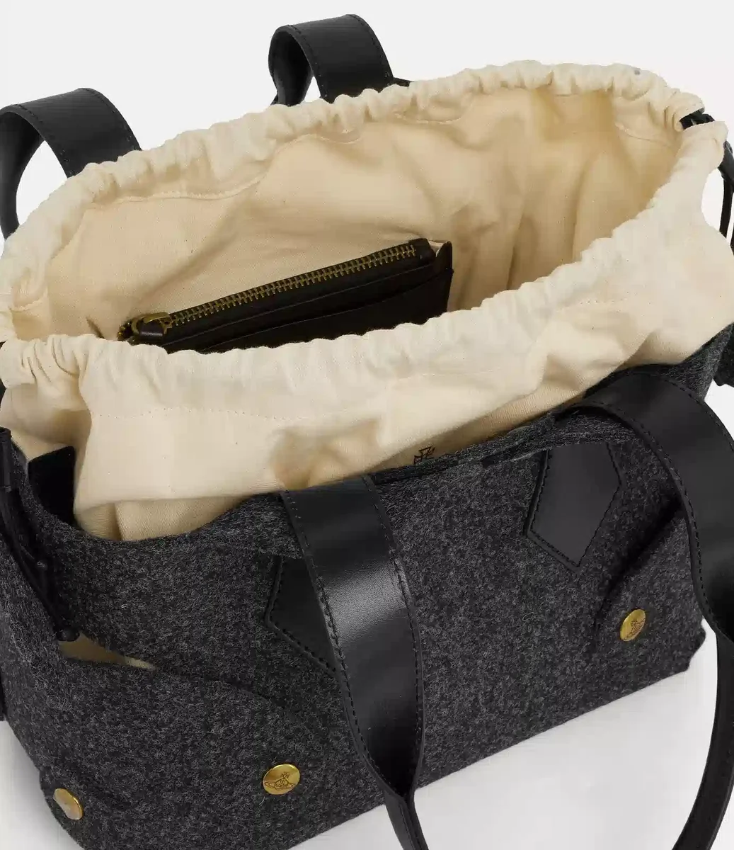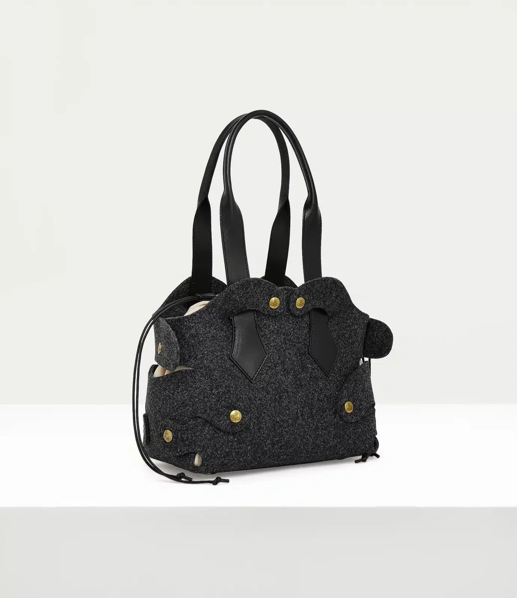 El bolso tote Wilma Small está confeccionado en fieltro de lana grueso utilizando una técnica de corte sin desperdicio desarrollada por primera vez para la colección Otoño-Invierno 2007 «Wake Up Cavegirl». Inspirado en nuestros bolsos Flintstone de archivo, la pieza cuenta con un sistema modular de botones a presión y asas con forma de punta de lanza que atraviesan la capa exterior.
