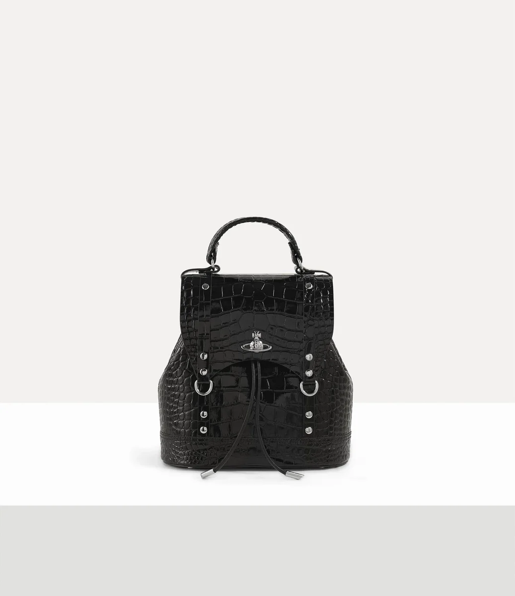 Nuestra emblemática mochila Max Small se presenta en un acabado de piel con relieve efecto cocodrilo, con una textura lacada que recuerda al látex líquido y las prendas de goma que se venden en nuestra icónica boutique Sex. La pieza presenta elementos inspirados en el bondage, que recuerdan a nuestra colección «Erotic Zones» de primavera-verano de 1995.