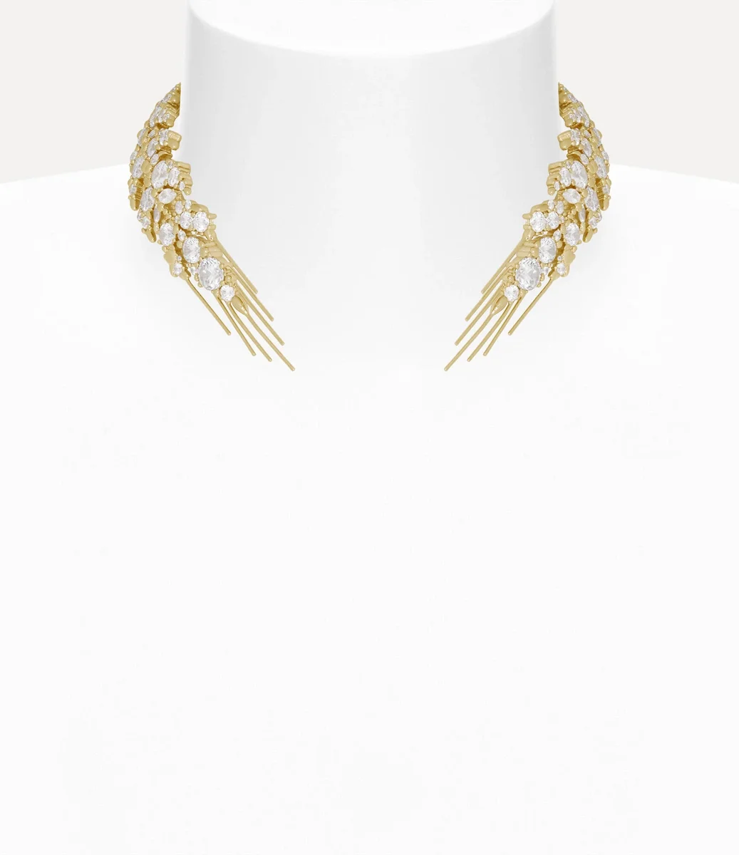 Inspirado en la mitología griega, el collar Chloris presenta dos motivos de trigo delicadamente entrelazados, que simbolizan la prosperidad, la fertilidad y la abundancia. Presentado por primera vez en la colección Primavera-Verano 2024 de Andreas Kronthaler, el diseño descansa elegantemente a lo largo del escote, adornado con brillantes cristales engastados en pavé y rematado con un discreto cierre de bisagra en la parte posterior.