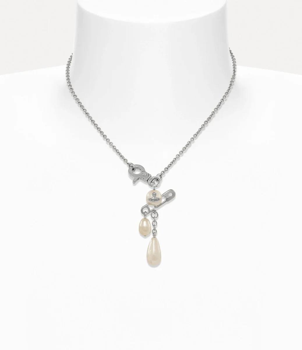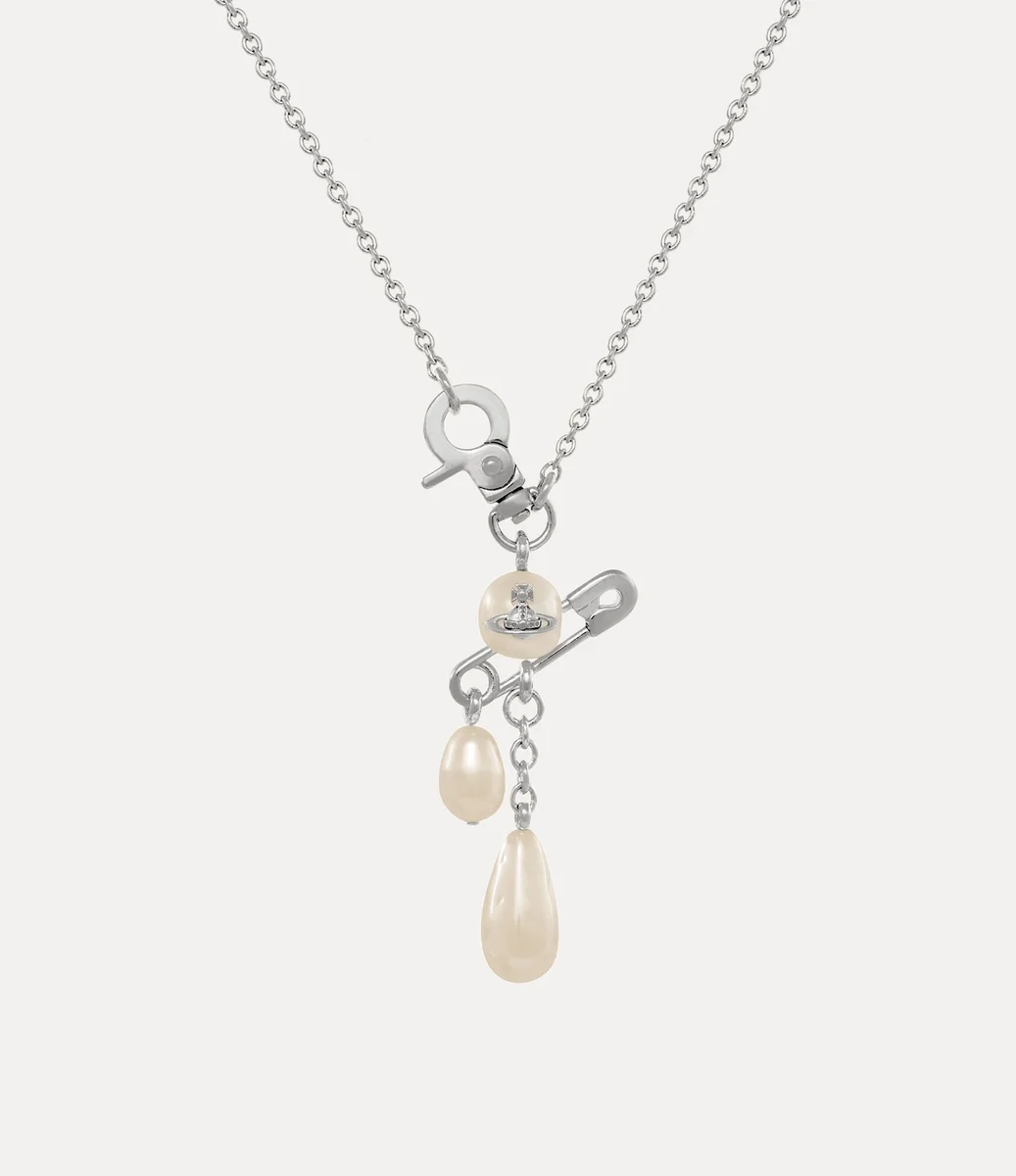 El collar Claude Small presenta una perla redondeada con un orbe central, acentuada por un detalle característico en forma de imperdible, un guiño al estilo inconformista e inspirado en el punk de Vivienne. Una perla en forma de gota y delicados detalles en cadena cuelgan elegantemente del colgante, añadiendo movimiento al diseño, mientras que el cierre inspirado en la ferretería permite un fácil cierre.