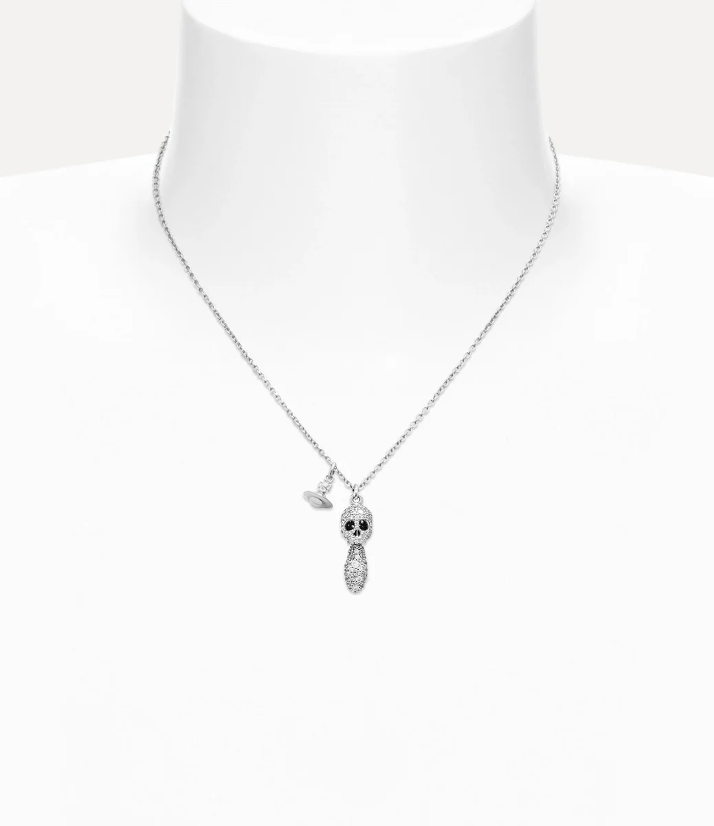 Nuestro collar con colgante Circe Orb presenta un motivo central de calavera, un motivo tradicional de la casa, adornado con hileras de brillantes piedras preciosas. Completado con un detalle de cristal en forma de lágrima, la pieza ofrece un orbe metálico colgante, que recuerda la visión de Vivienne de lanzar la tradición hacia el futuro.