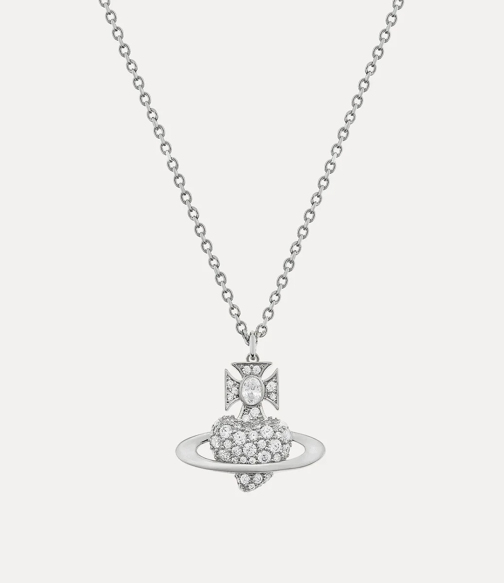 Nuestro collar con colgante en bajorrelieve Agnatha de Valentine’s revive un diseño asimétrico de corazón de archivo, que refleja el amor de Vivienne por la humanidad y el planeta. El colgante en forma de corazón, adornado con brillantes detalles de cristal blanco, está rodeado por los anillos celestes de Saturno en esmalte blanco, que simbolizan el futuro, y está adornado con un baño pulido en tono plateado.