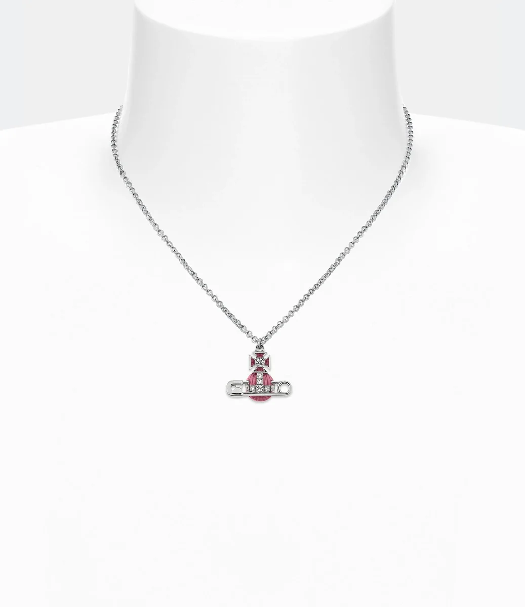 Nuestro collar con colgante Kitty presenta nuestro clásico emblema esférico, pintado a mano con esmalte rosa translúcido para revelar un intrincado patrón metálico debajo. La pieza tiene un acabado plateado y se completa con un motivo de imperdible, símbolo de inconformismo, que recuerda el característico enfoque punk de Vivienne.