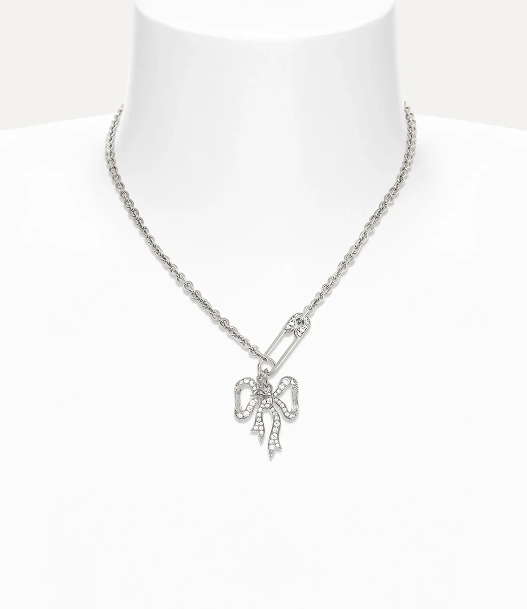 El collar con colgante Lilith presenta la iconografía característica de la casa, combinando un lazo de inspiración georgiana con una silueta de imperdible que hace referencia a la estética punk de Vivienne. Adornado con cristales blancos, el diseño en tono plateado está rematado con un cierre de langosta seguro y una etiqueta con el emblema del orbe.