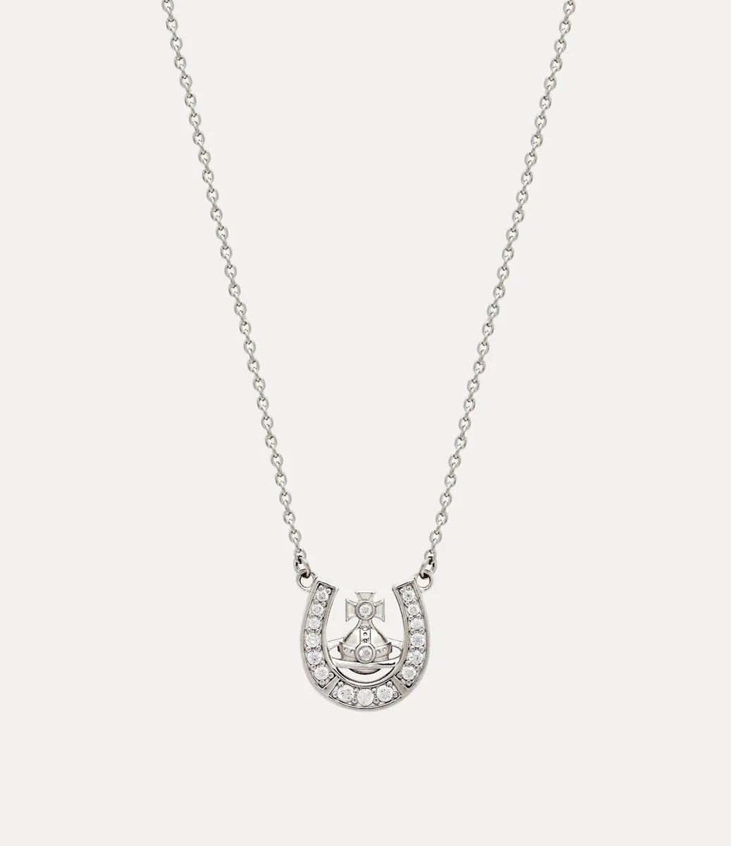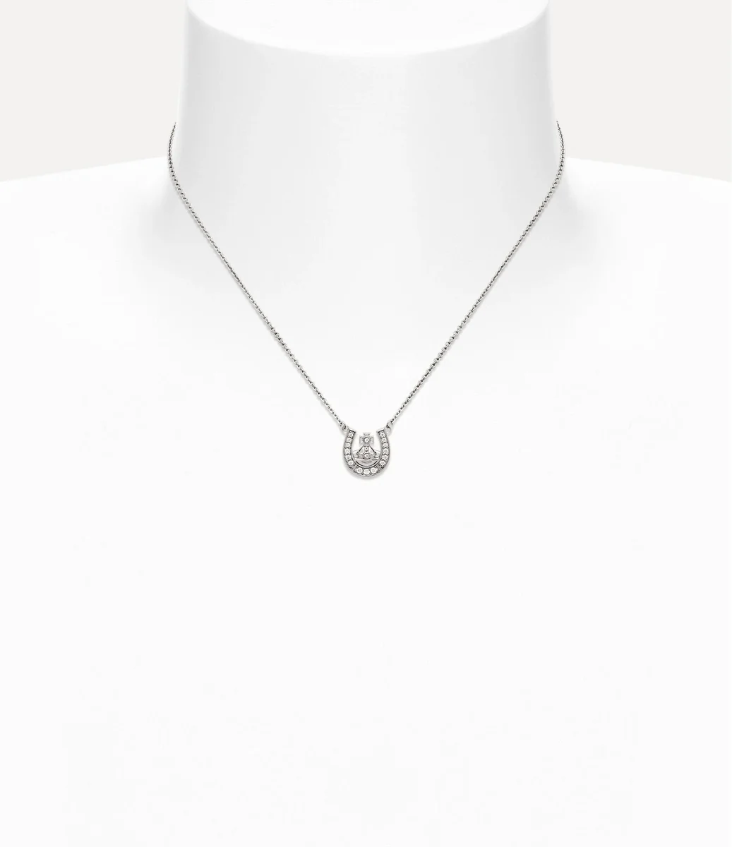 Nuestro collar con colgante Mare está elaborado en plata reciclada y cuenta con un baño pulido en tono platino. El diseño presenta el clásico motivo de la casa, el orbe y la herradura, en homenaje a la iconografía característica de la firma, adornado con detalles de cristal en tonos similares.