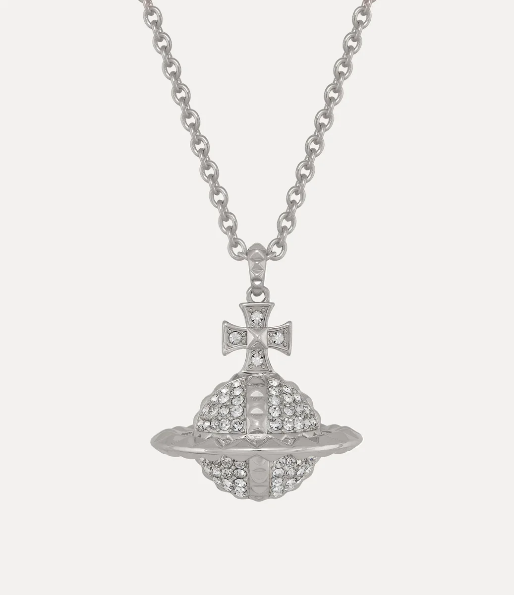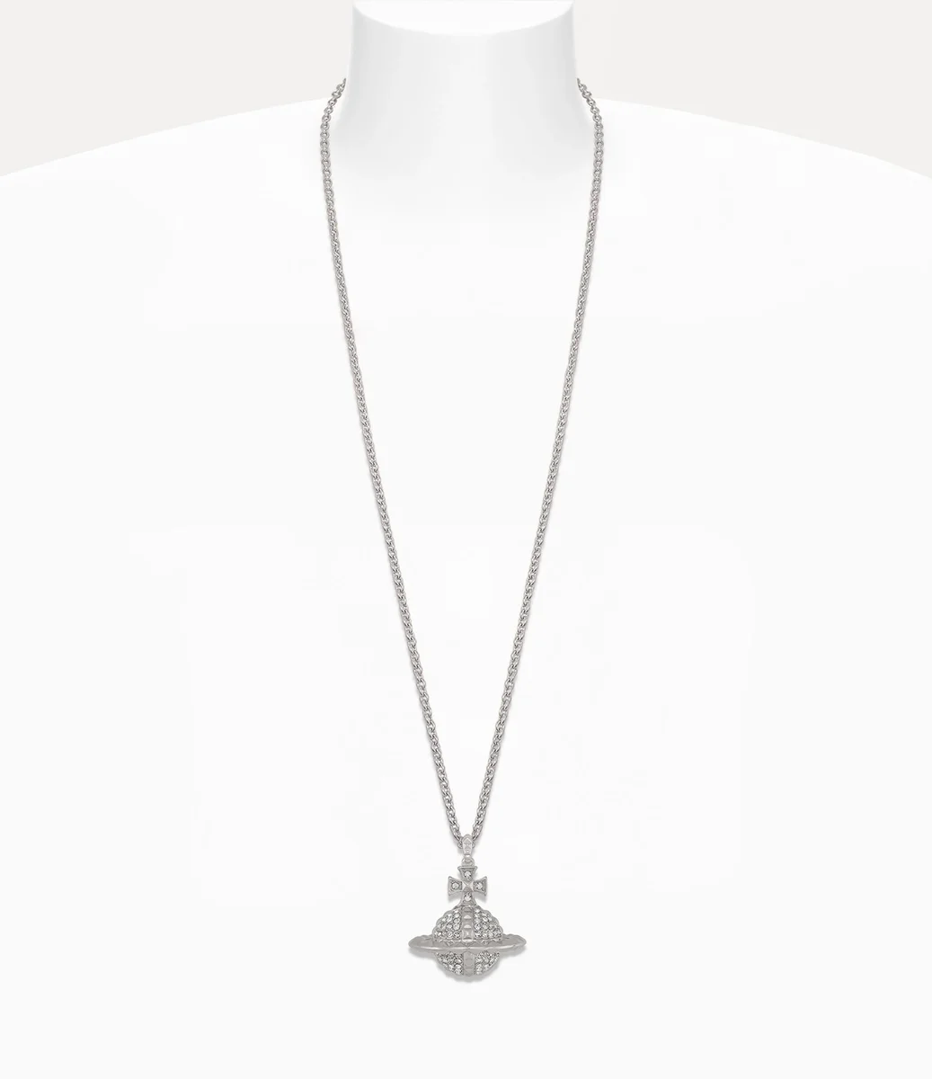 Nuestro collar con colgante Mayfair Large Orb se ha renovado con un baño plateado y está incrustado con piedras preciosas blancas. Los detalles piramidales recorren todo el diseño, simbolizando la inconformidad y rindiendo homenaje a la icónica estética punk de la casa. Esta pieza llamativa presenta nuestro característico motivo orbital, que encarna la visión de Vivienne de redefinir la tradición para el futuro.