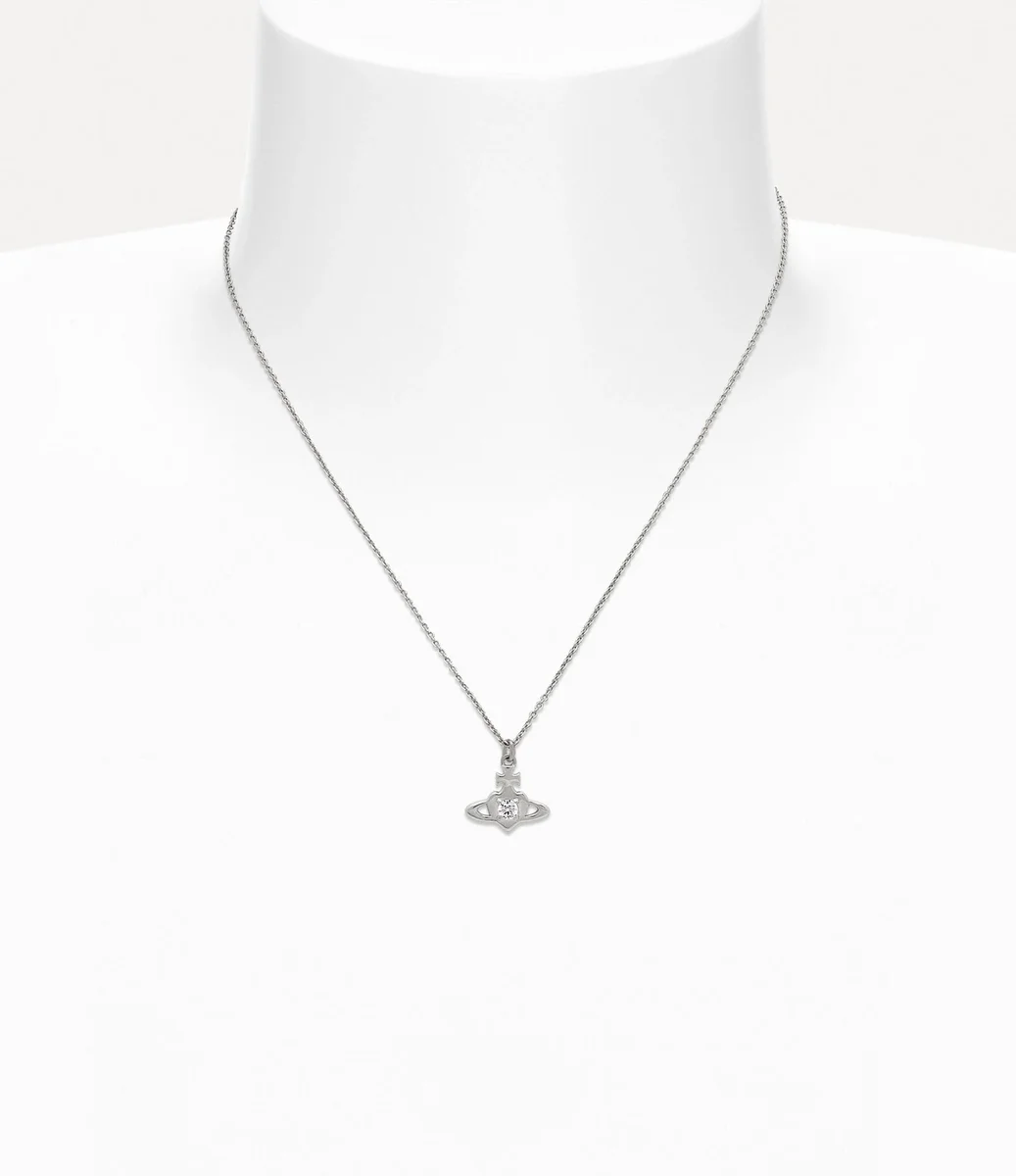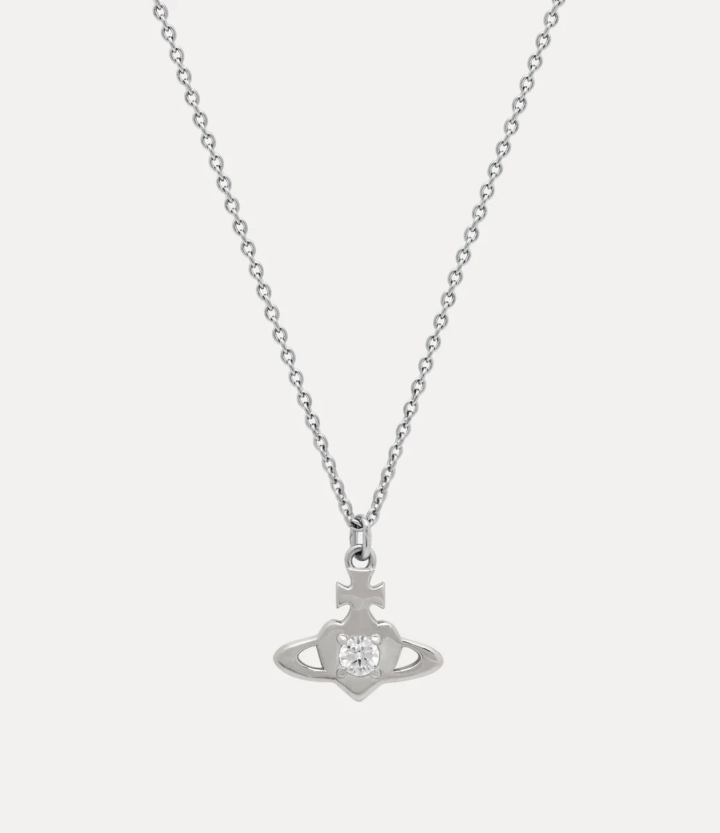 Nuestro collar con colgante Noella presenta un acabado en tono platino, adornado con un motivo de corazón esférico, que recuerda el afecto de Vivienne por la humanidad y el planeta. Elaborada en plata reciclada, la pieza tiene incrustado un cristal blanco en el centro del diseño.
